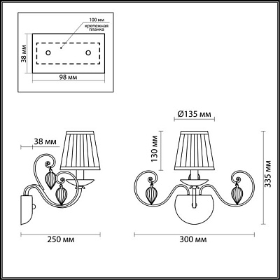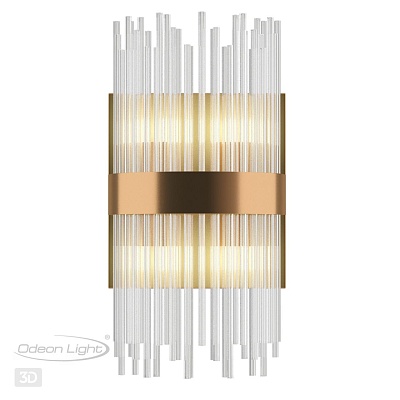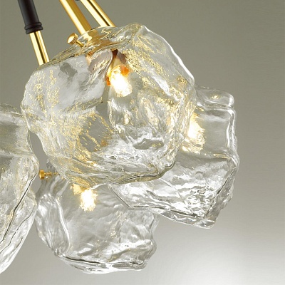 Металлическая арматура. Цвет – французское золото. Декор – рельефные лепестки двух видов: в тон арматуре и из прозрачного фактурного стекла. Современная интерпретация флористического дизайна. Источник света – лампа с цоколем Е14.