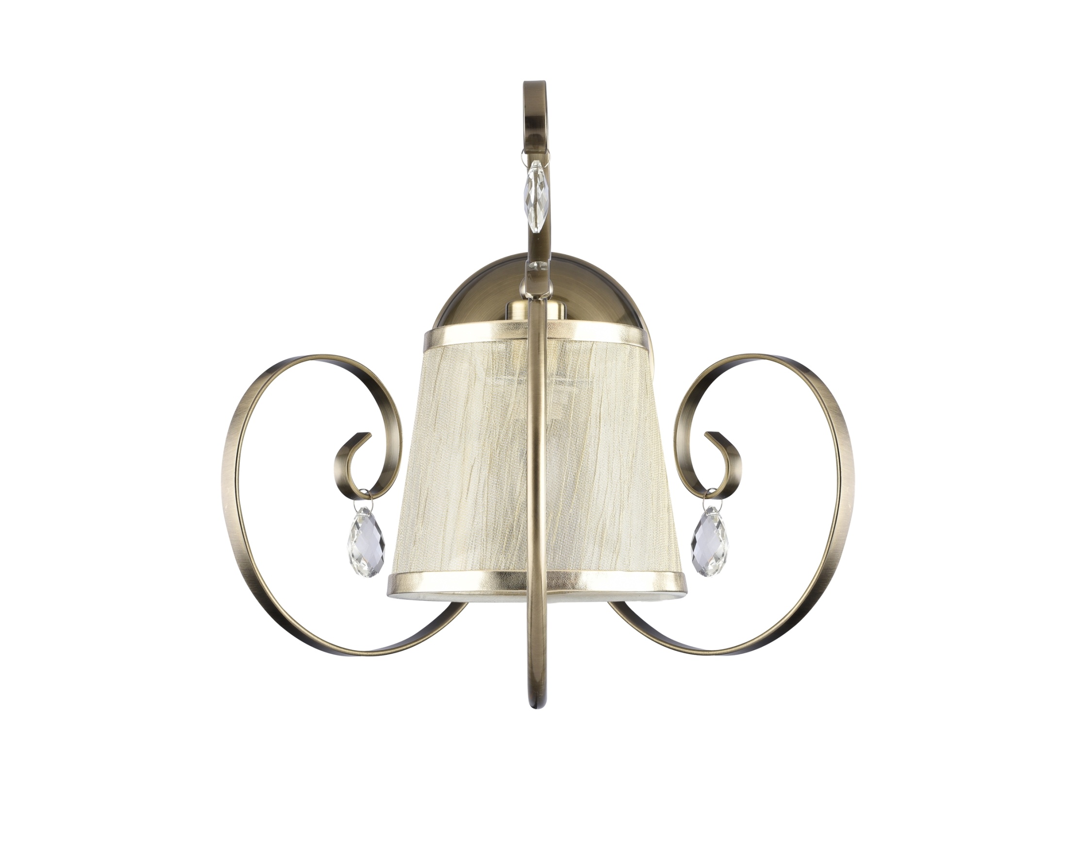 Абажуры и арматура светильников выполнены в разных цветах, с несколькими видами арматуры. Основание люстры украшено стеклянным декоративным элементом, а завитки рожков украшают подвески.