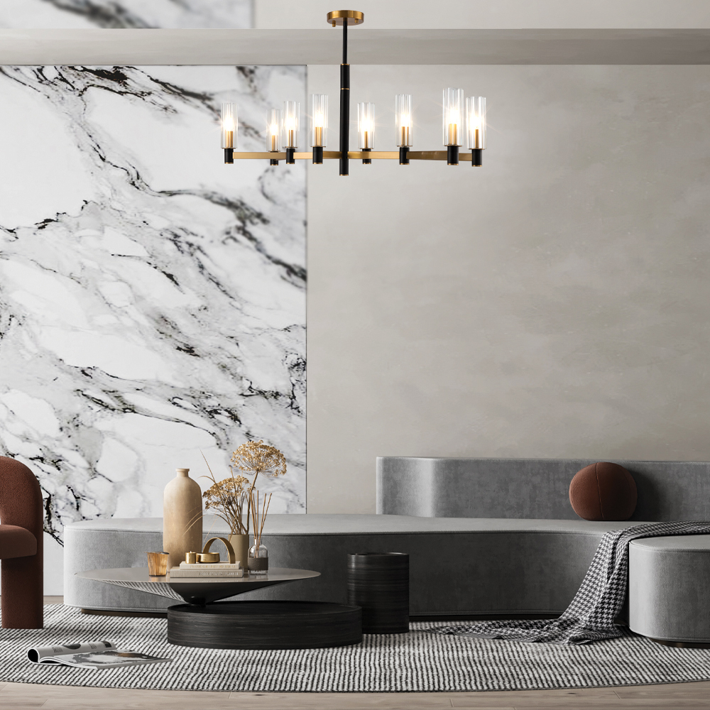 Арматура из металла сочетает два оттенка: черный и латунь. Плафоны цилиндрической формы выполнены из рельефного прозрачного стекла. Актуальная геометрия с настроением американской классики. Источник света – лампа с цоколем E14.