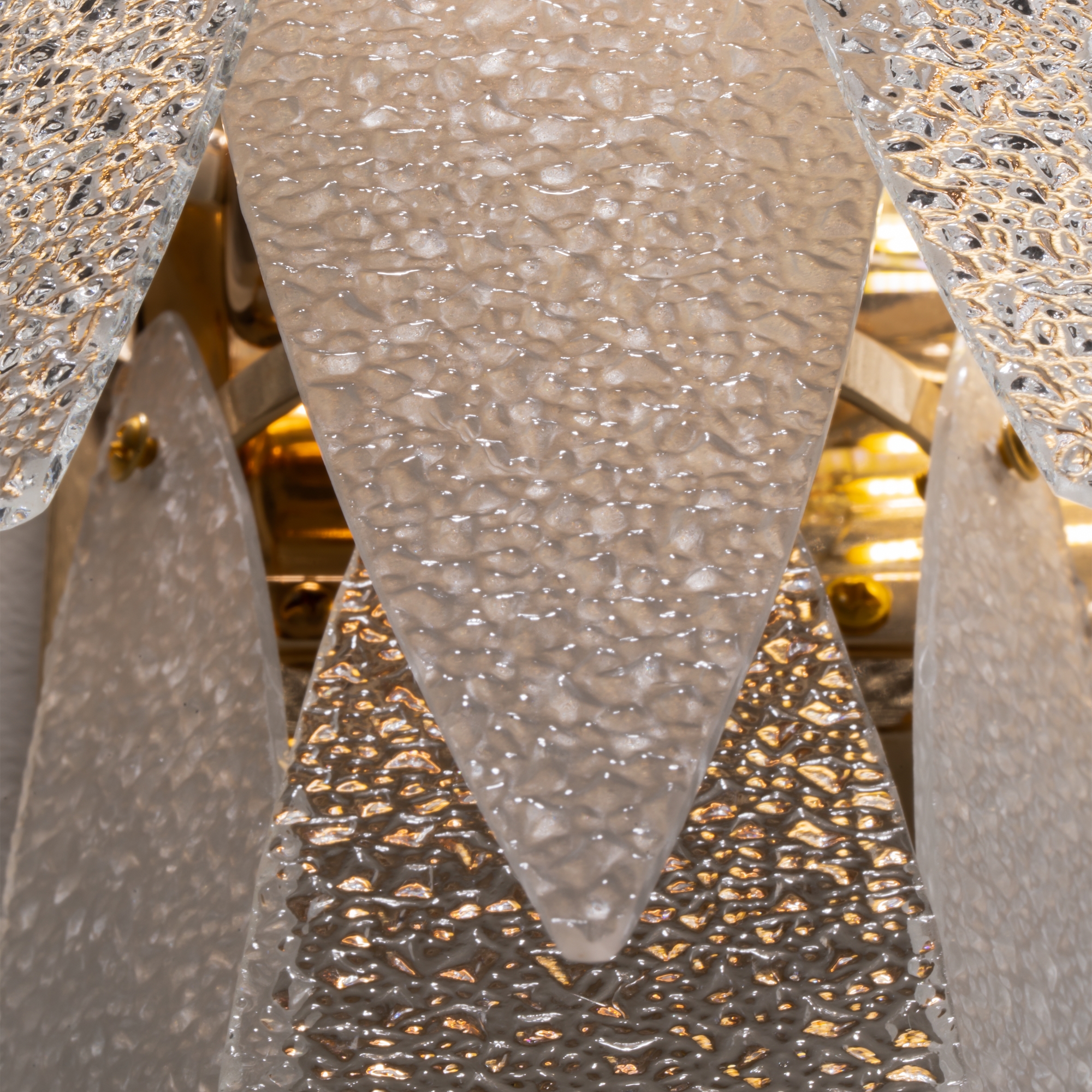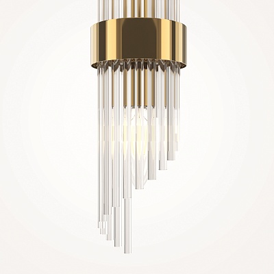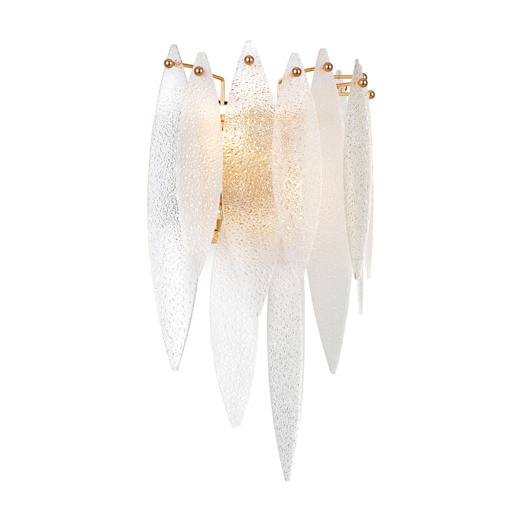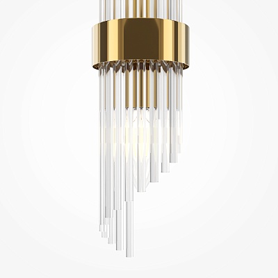 Металлическая арматура, цвет – французское золото. Декоративные элементы выполнены из прозрачного стекла в форме пестрых лепестков ледяной фактуры. Источник света – лампы с цоколем Е14, которые скрыты за декоративными подвесками, размещенными на металлической окружности. Высота подвесов регулируется.