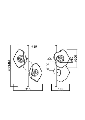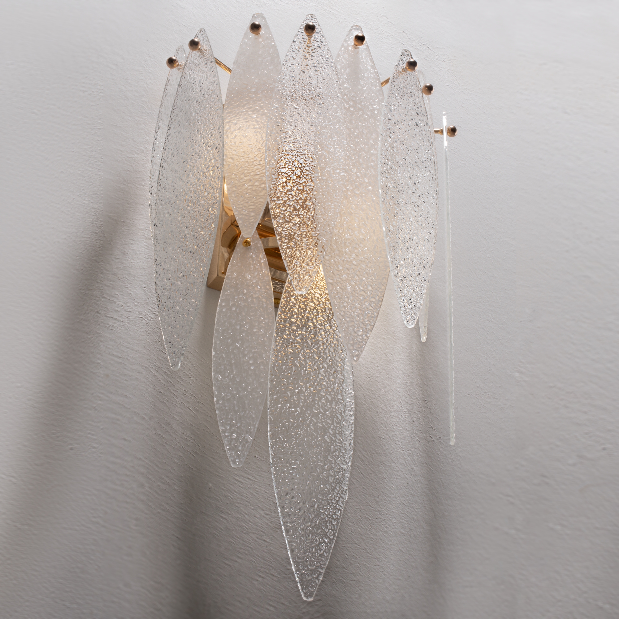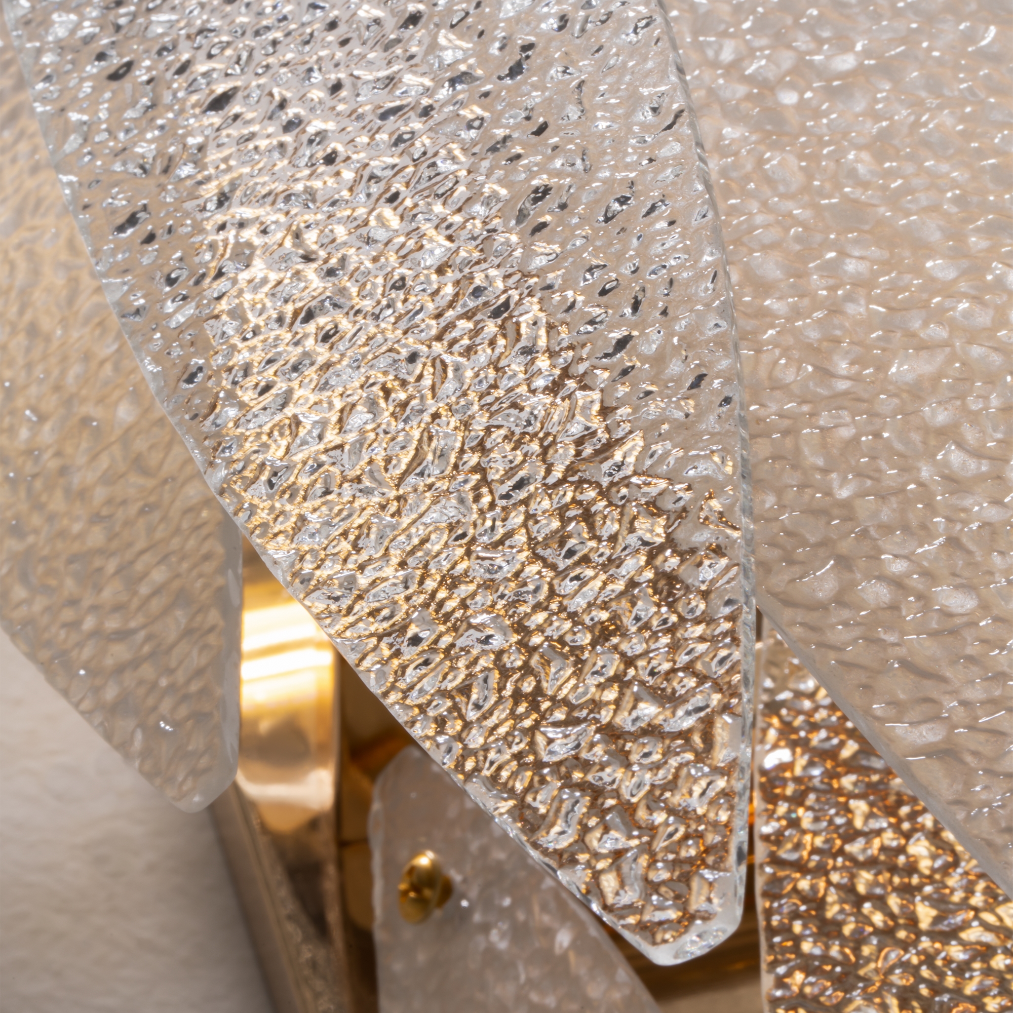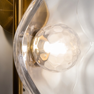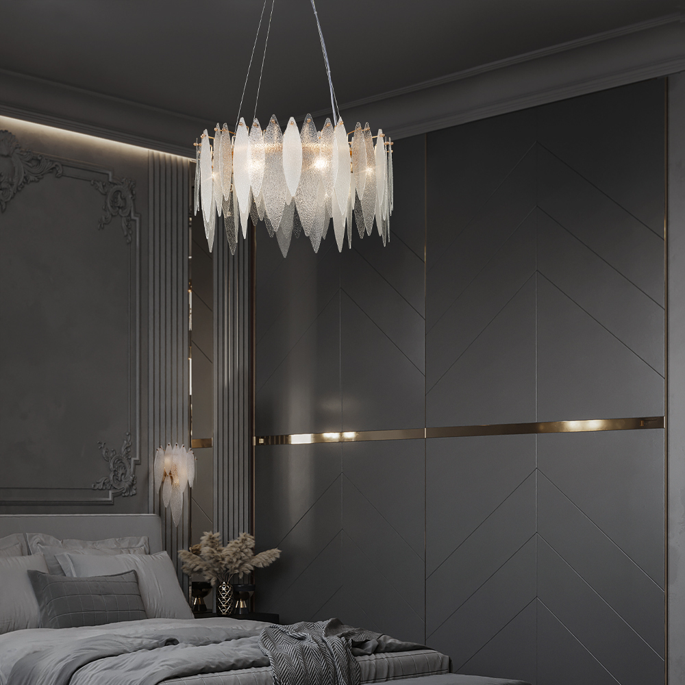 Металлическая арматура, цвет – французское золото. Декоративные элементы выполнены из прозрачного стекла в форме пестрых лепестков ледяной фактуры. Источник света – лампы с цоколем Е14, которые скрыты за декоративными подвесками, размещенными на металлической окружности. Высота подвесов регулируется.