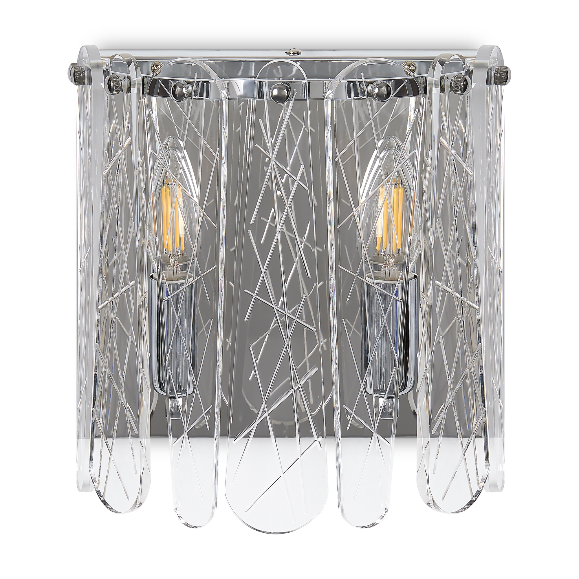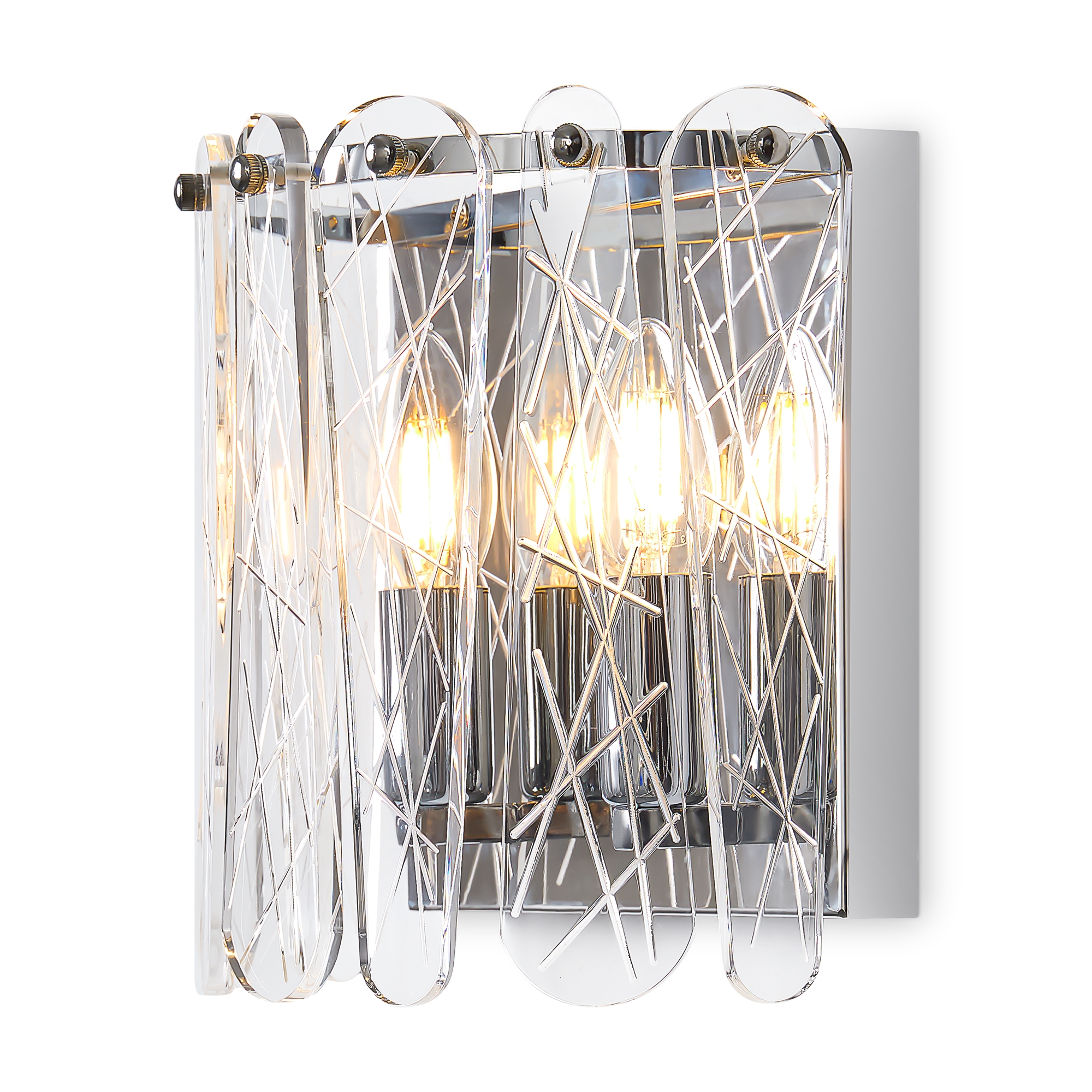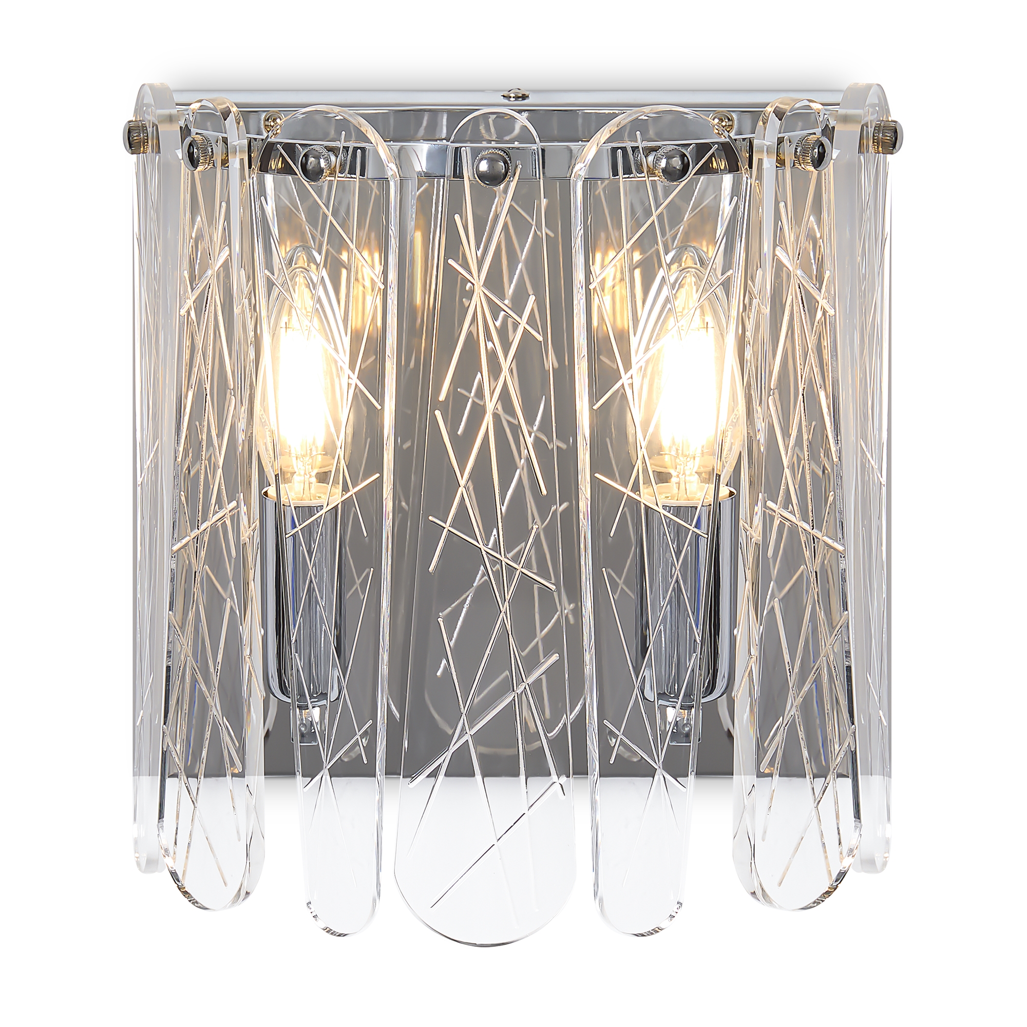 Материал арматуры — металл, цвет — хром. Светильники выполнены из хрусталя с рисунком frozen". Подвесные светильники и бра с цоколем E14. Современный дизайн арматуры, дугообразные формы с хромированной отделкой подчеркивают декоративные хрустальные элементы. Подходит для современных интерьеров."