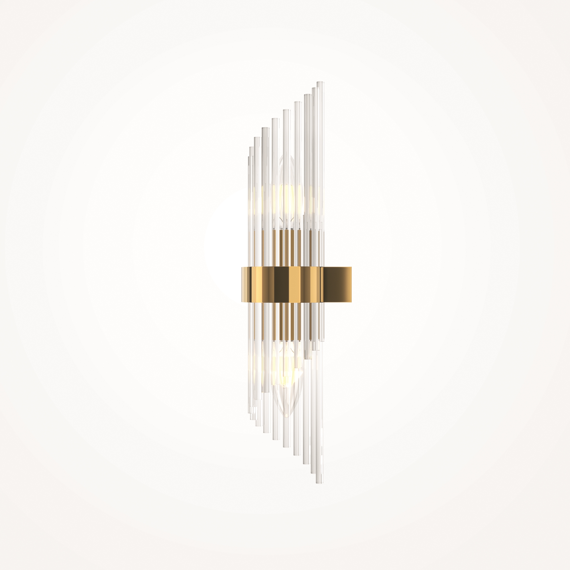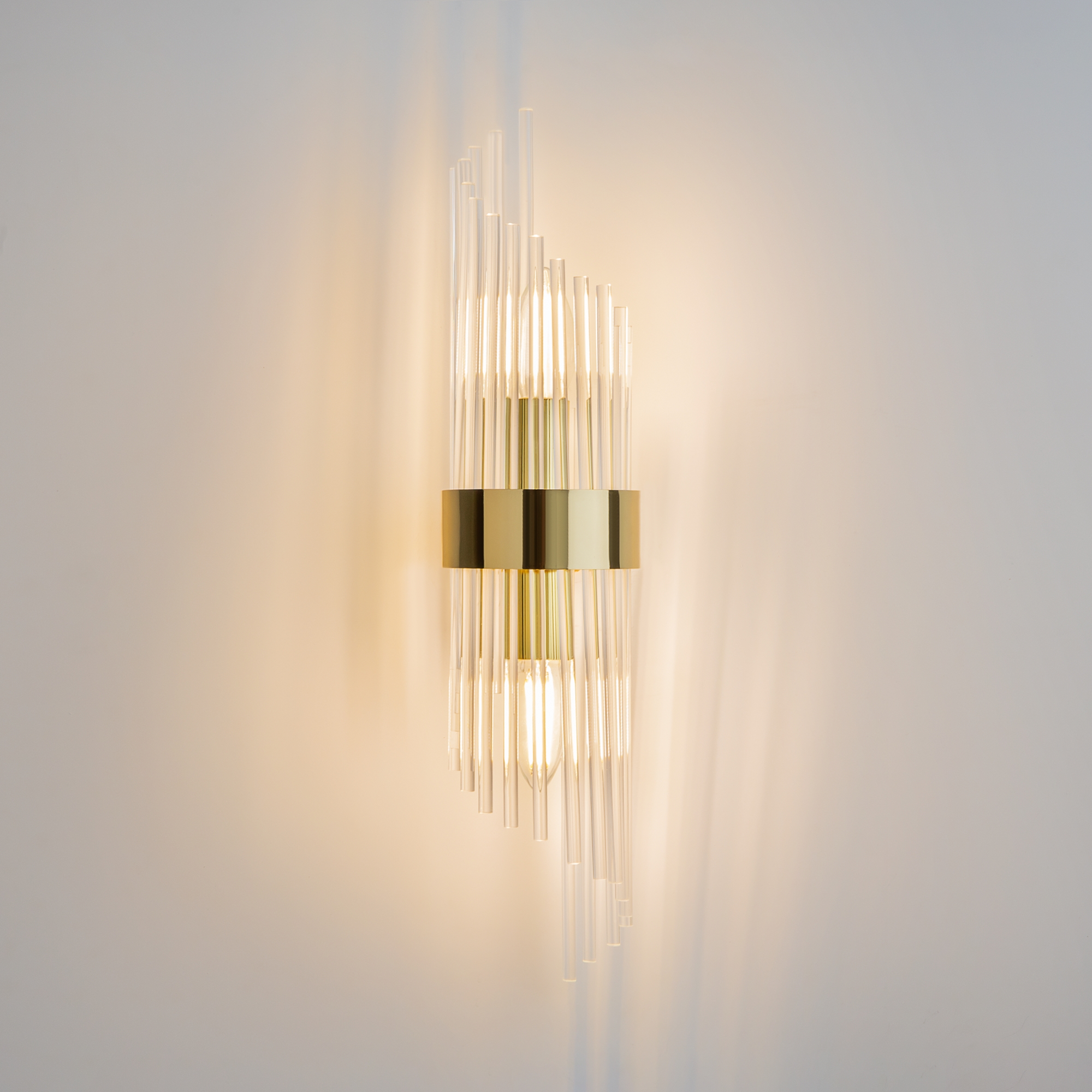 Материал арматуры - металл, цвет - золото. Декоративный элемент из прозрачного стекла в форме рельефных трубок. Цоколь Е14. Лампы в комплект не входят.
