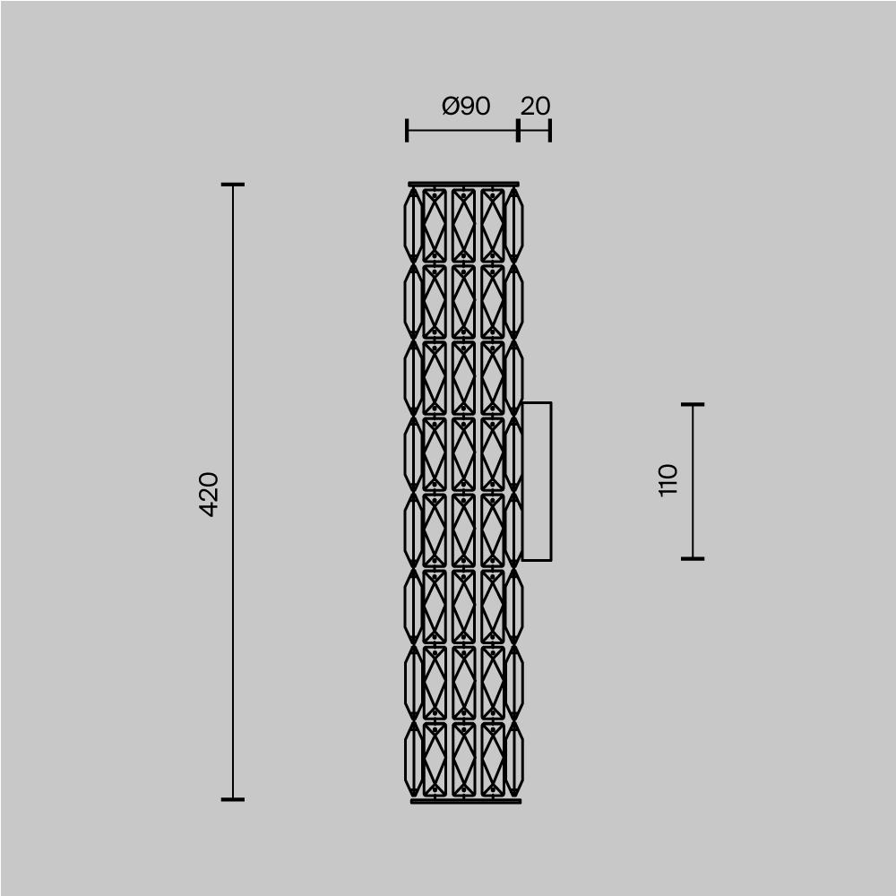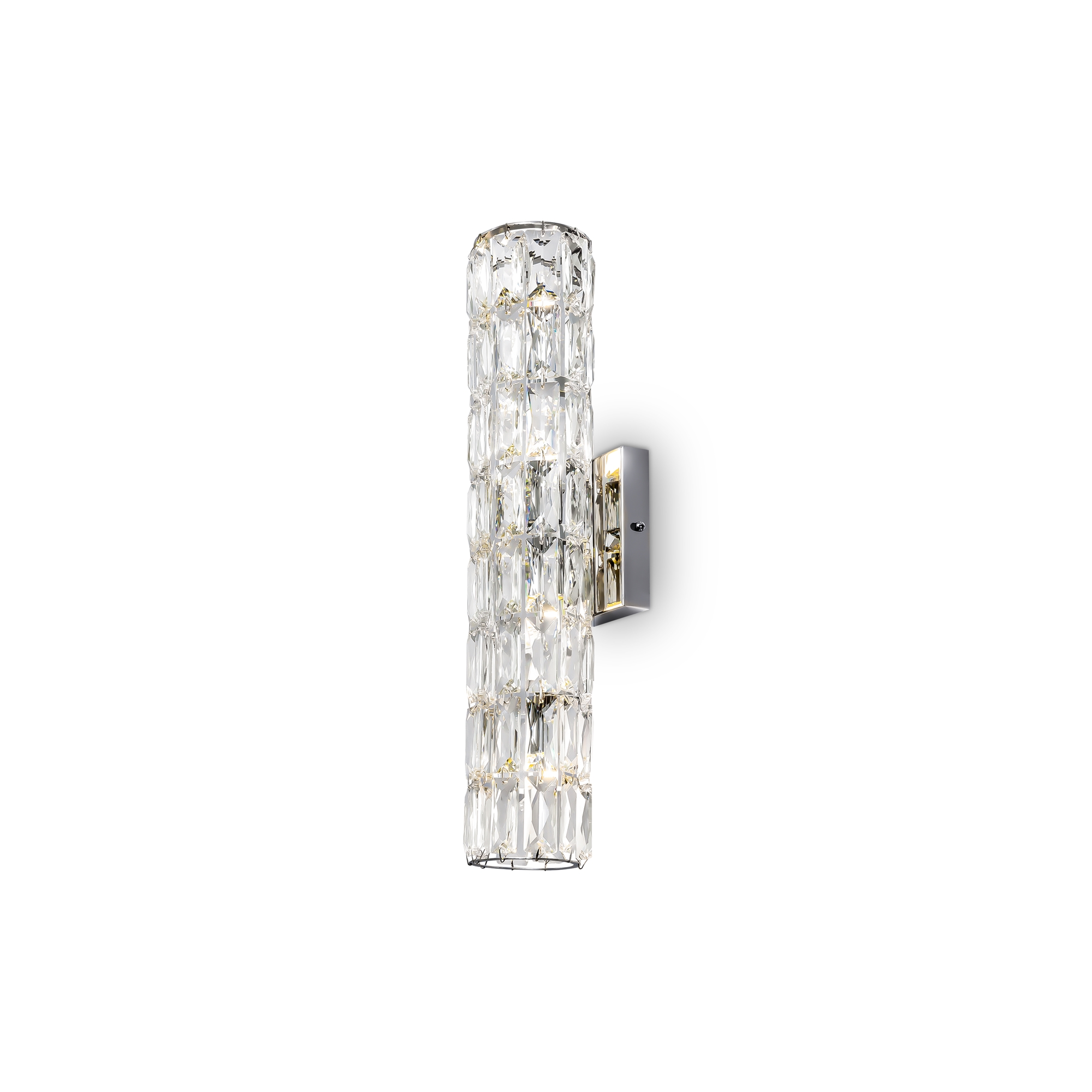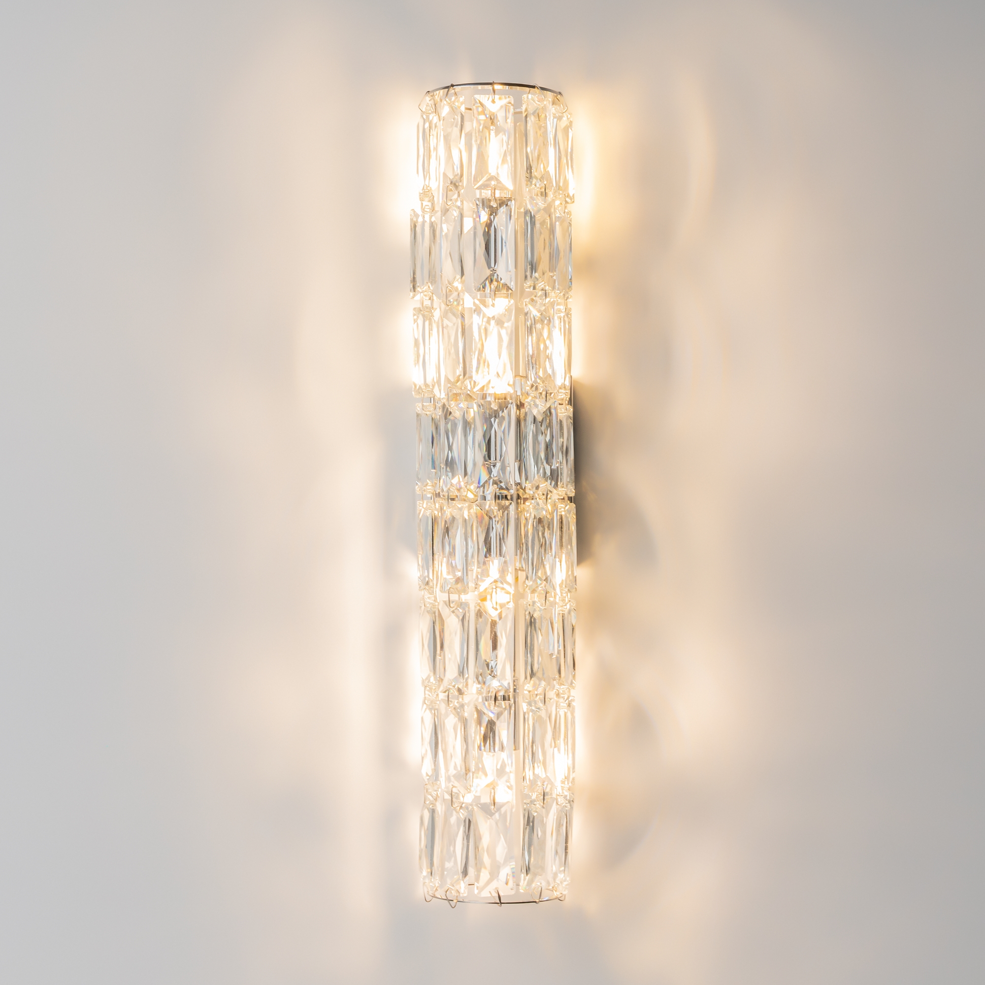 Арматура из металла, цвет – хром. Абажуры из текстиля, нанесенного на ПВХ. Цвет – белый. Декор – массивные кристаллы сложной огранки. Высота подвесных моделей регулируется.