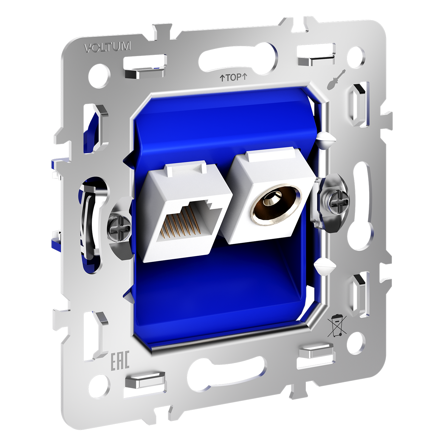 Назначение. Механизм розетки TV+RJ45 в одном модуле обеспечивает одновременное подключение телевизионного кабеля и интернет-соединения. Конструкция позволяет сократить количество точек подключения, создавая аккуратный и эстетичный вид для вашего интерьера. Место установки. Механизм розетка обеспечивает одновременную передачу ТВ-сигнала и проводного интернета — оптимальное решение для современных мультимедийных зон в квартирах, отелях и офисах. Конструктивные особенности. Интернет разъём поддерживает подключение к сетям категории 6 и 5е, обеспечивая скорость передачи данных до 1000 Мбит/с. TV-разъём подходит для подключения к стандартным антеннам кабельного телевидения Серия S70 доступна в модульной системе: механизм, накладка и рамка поставляются отдельно.
