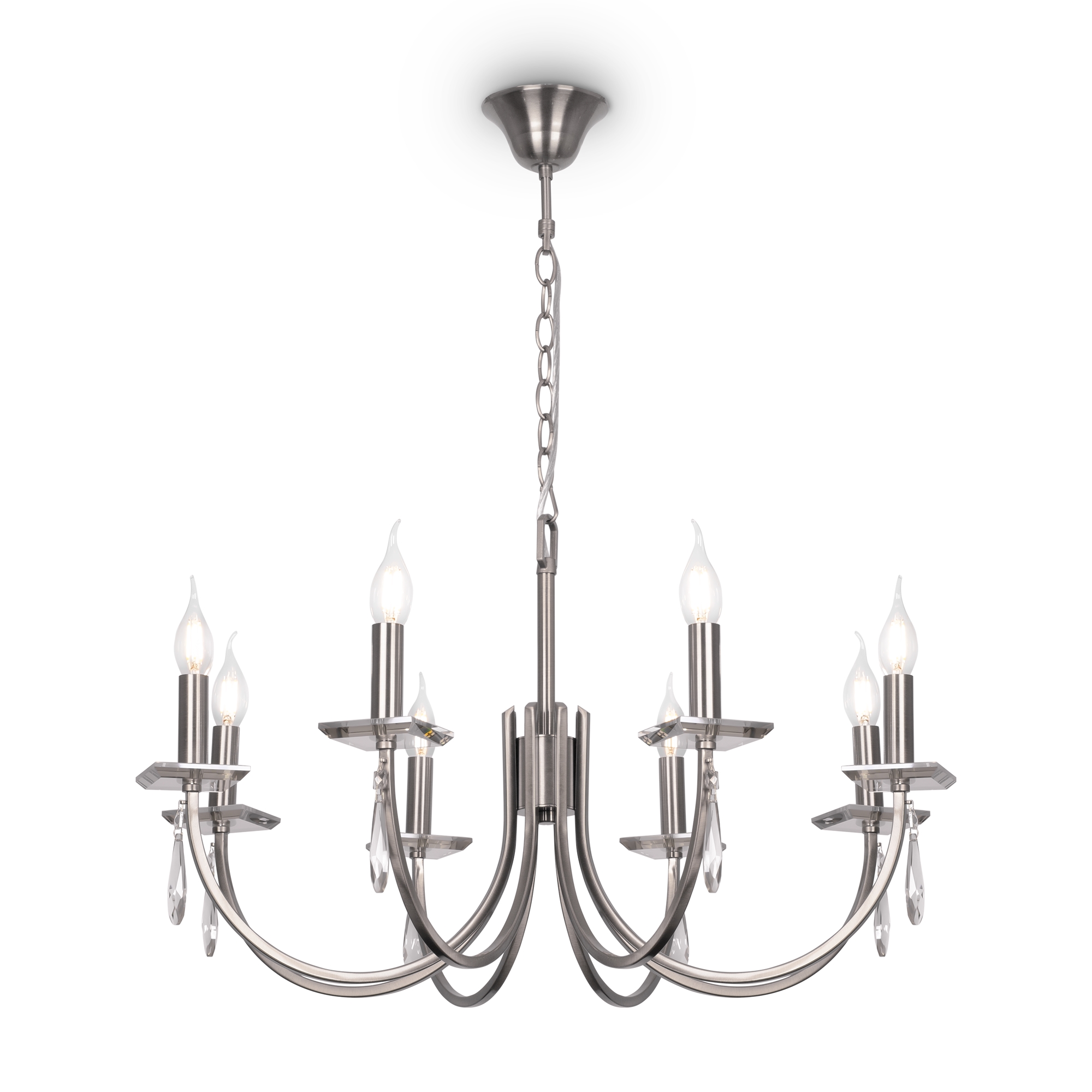 Металлическая арматура в двух оттенках: латунь и никель. Классическая форма плафона в виде свечи. Торшер и настольная лампа имеют тканевые абажуры. Белые – для арматуры цвета никель, оттенка кремовый шампань – для латунной. Декор – прозрачные хрустальные подвесы каплевидной формы. Торшер с цоколем Е27, лампа, бра и люстры – Е14.