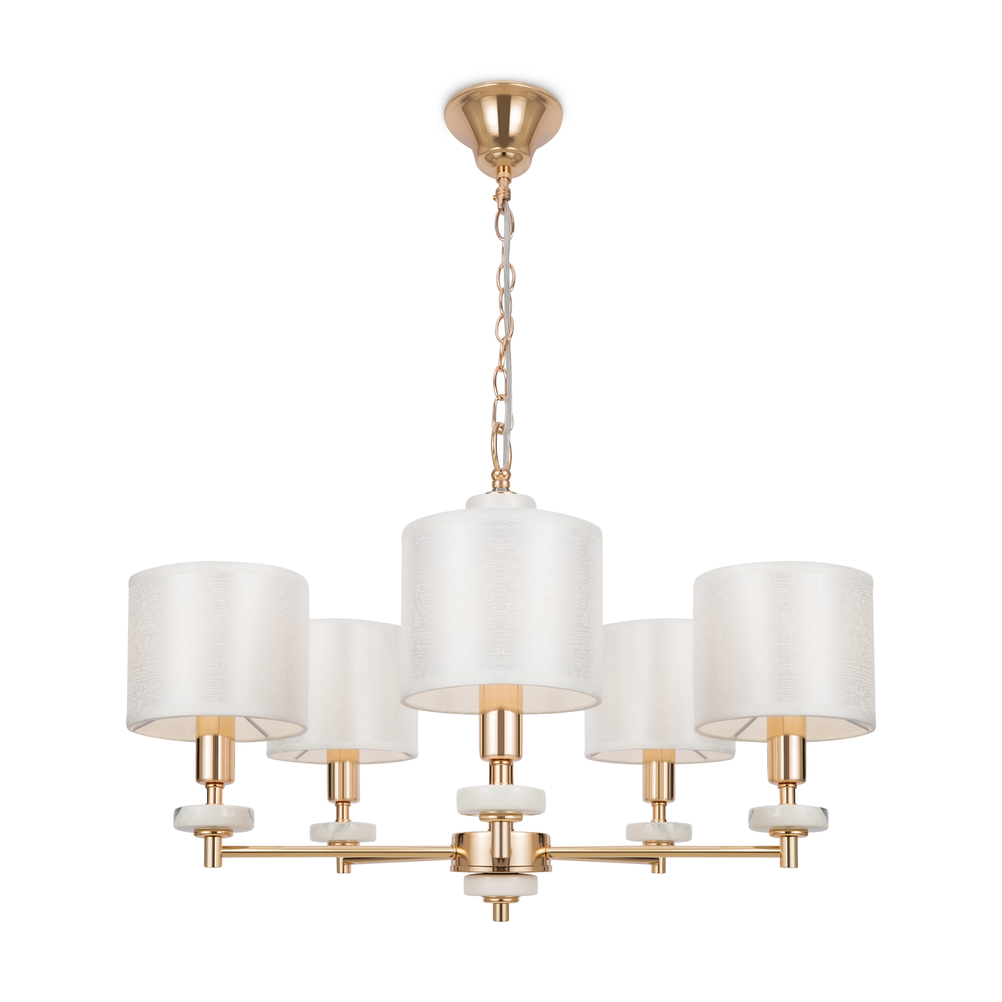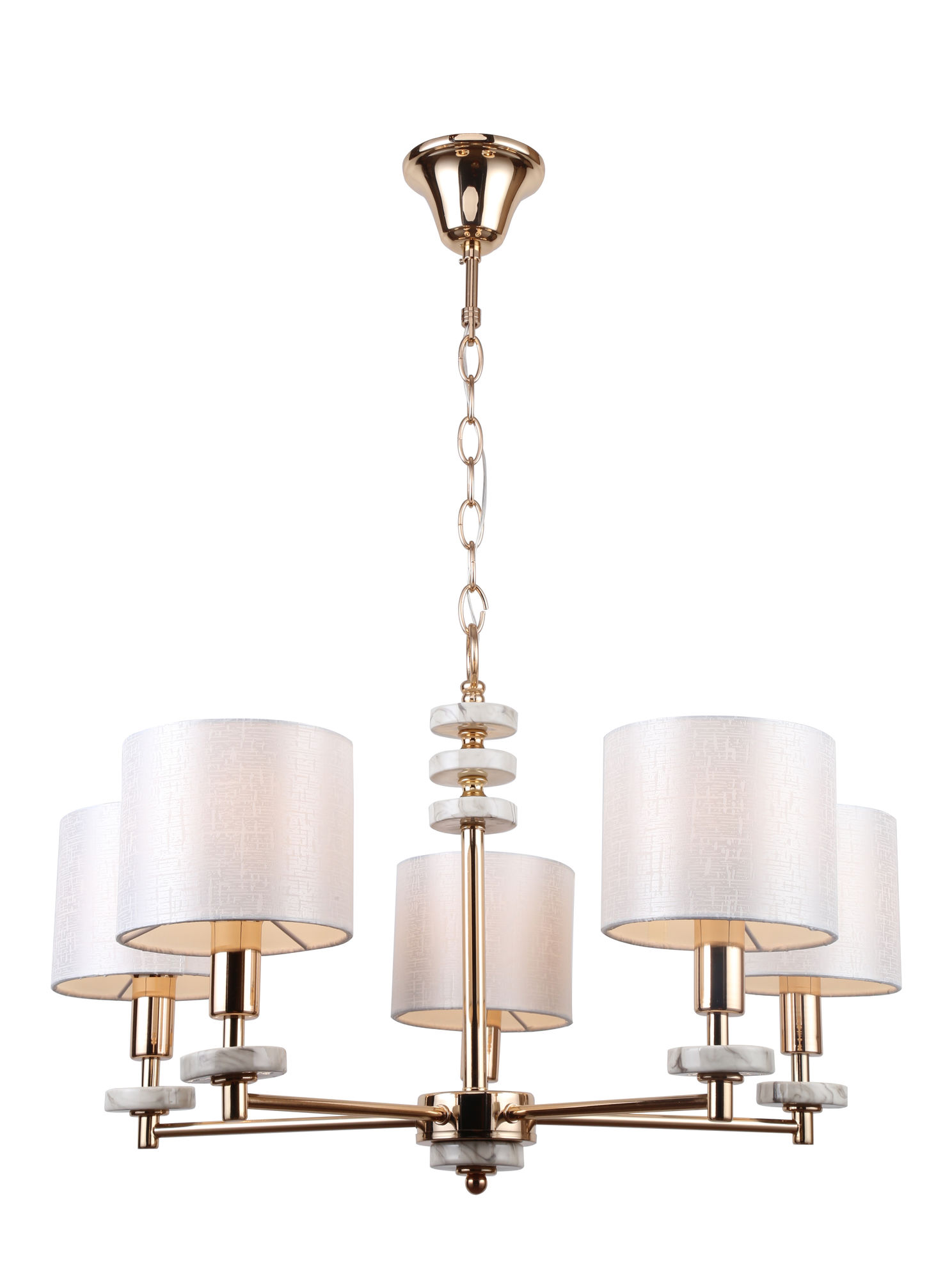 Металлическая арматура золотого оттенка. Абажуры – текстиль на ПВХ кремового цвета. Трендовый керамический декор с имитацией мрамора. Источник света – лампа с цоколем E14.
