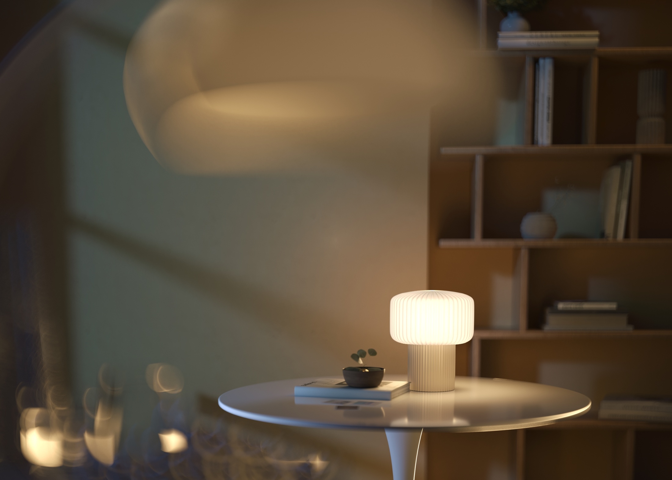 В дизайне серии объединены тренды на рельефность и форму грибочка". Основание украшено вертикальным рельефом. Сочетание текстур белого стеклянного плафона и керамического основания. В серии два пастельных оттенка: кремово-белый (RAL 9001) или серебристо-серый (RAL 7001). Цоколь сменного источника настольных ламп — G9. LED-источник у портативного светильника. Трендовые дизайн и цветовая палитра делают идеальным дополнением для любого пространства — гостиная, рабочий стол или прикроватная тумбочка."