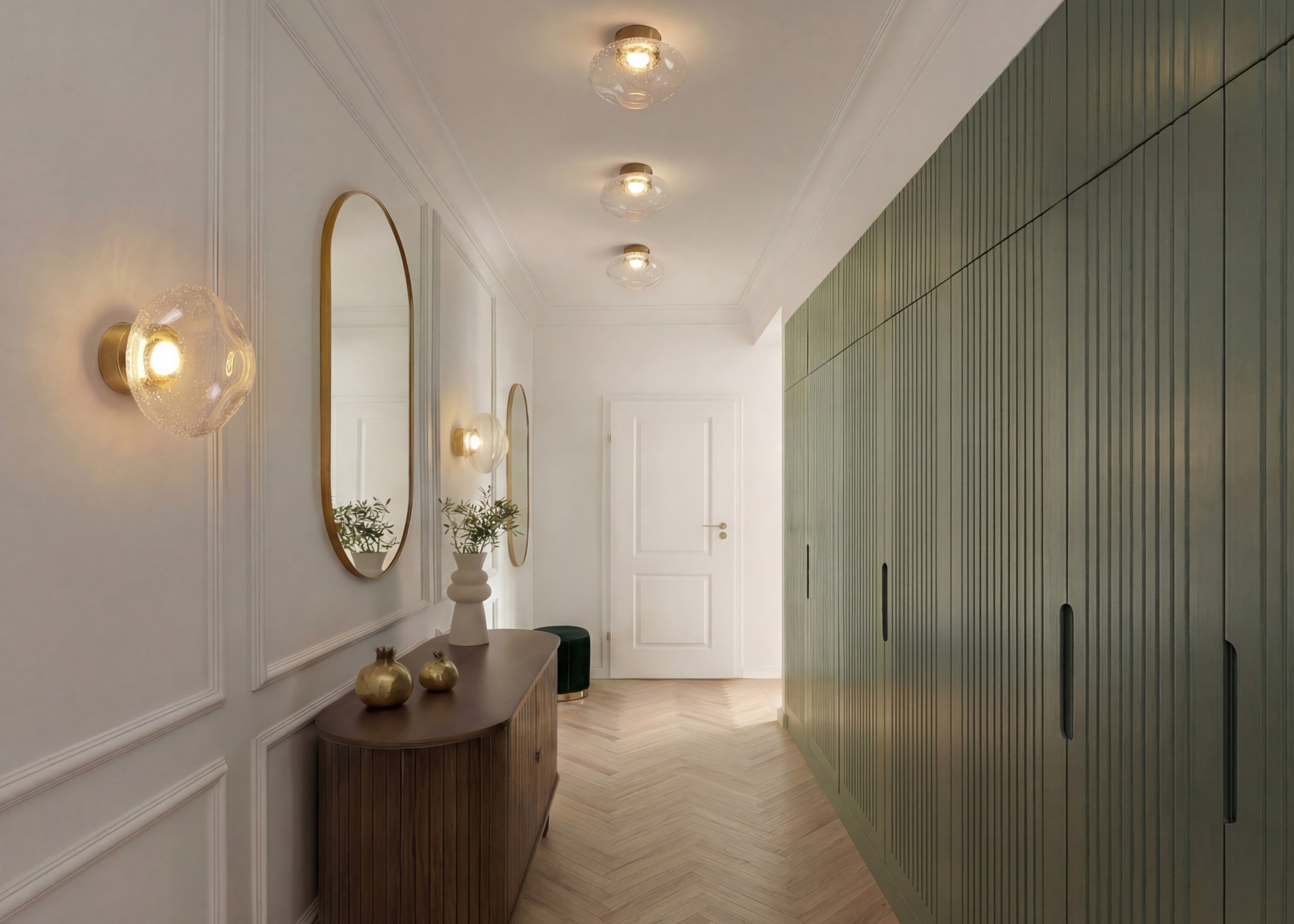 Арматура — металл. Стеклянные плафоны с пузырьками в трёх цветах: дымчатый, прозрачный, янтарный. Интегрированный LED источник света 3000К, Ra 80, угол 180°. Высота регулируется.