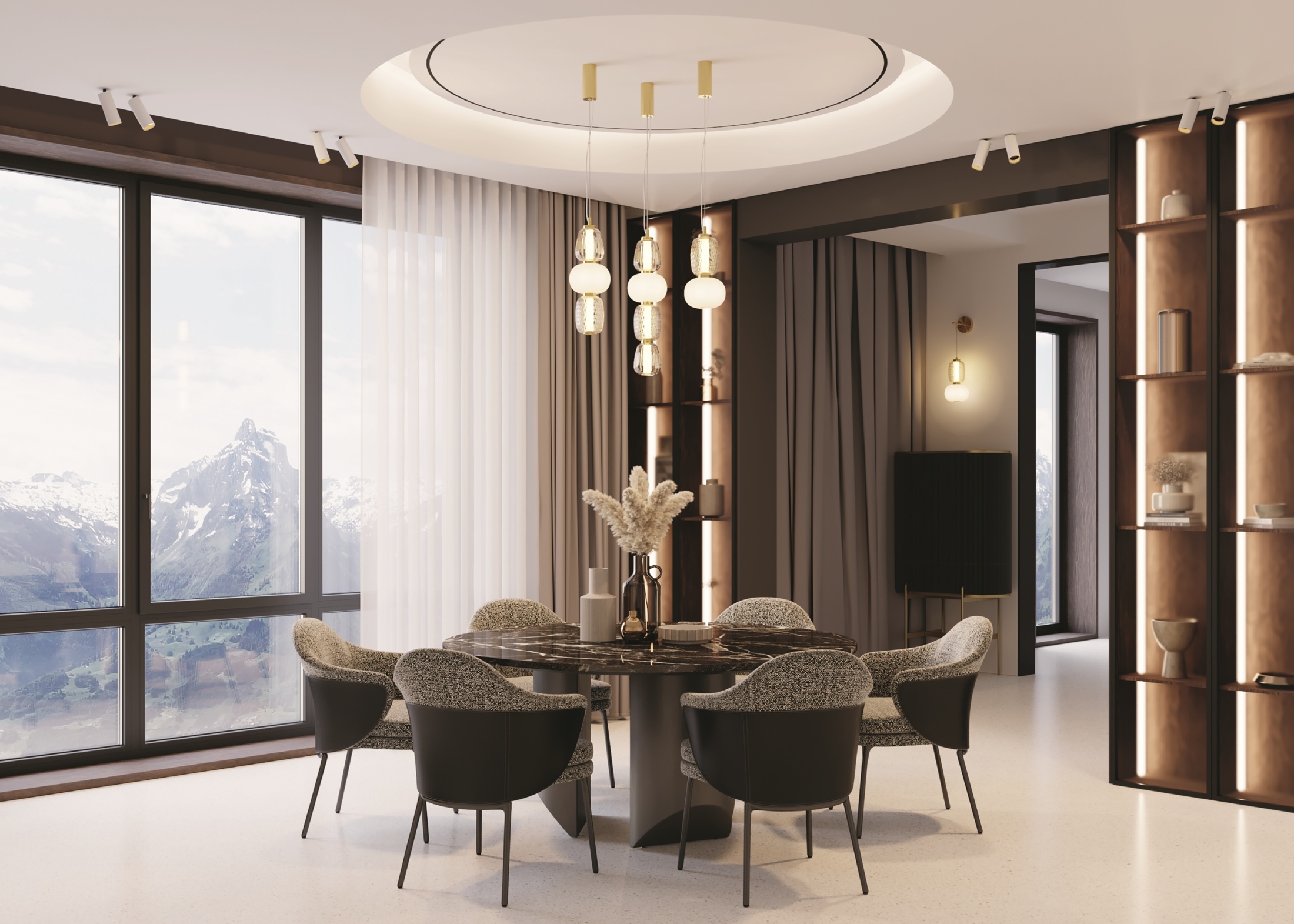 Металлическая арматура, цвет - золото, хром. Микс плафонов округлых и вытянутых форм из белого матового и прозрачного стекла с сетчатым и с линейным повторяющимся рельефным рисунком. Регулируемая высота подвесных моделей, провод - 3 метра. LED-источник света, цветовая температура 3000К.