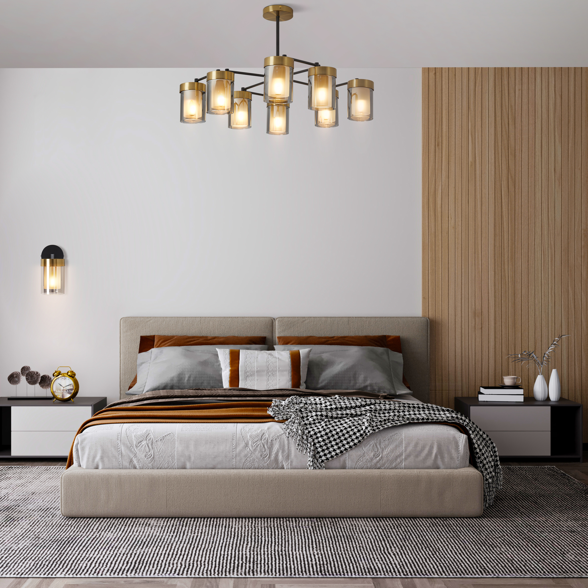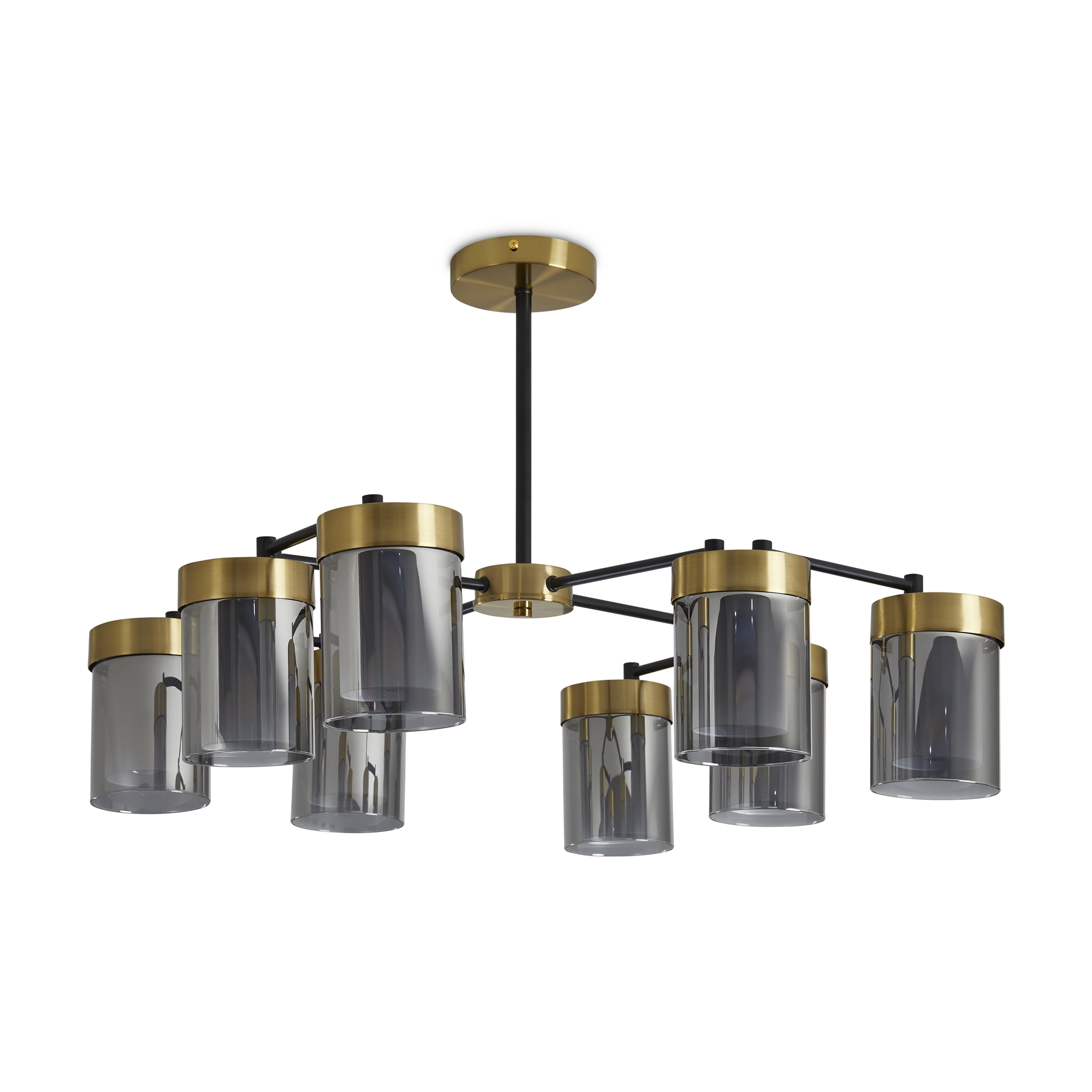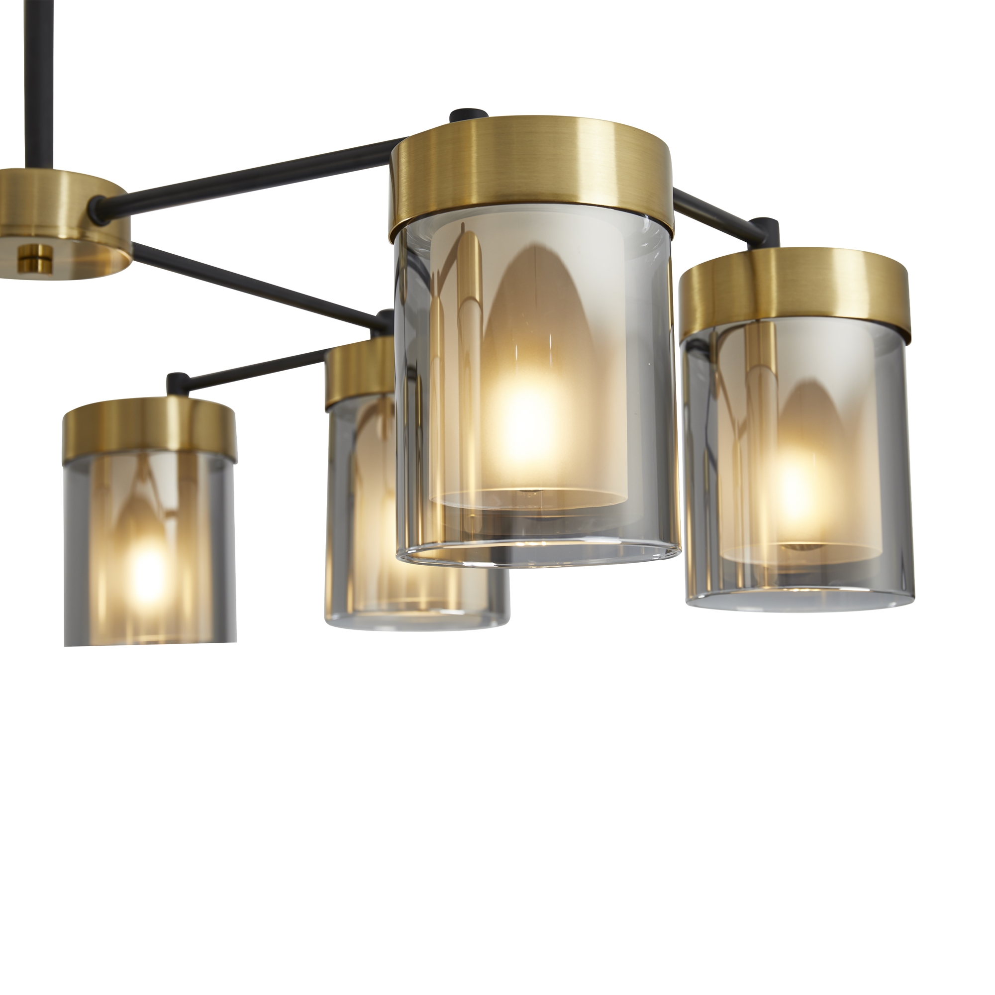 Арматура - металл в двух востребованных оттенках латунь и черный. Плафоны из двойного стекла дымчатого оттенка, внутри белый матовый. Трендовая форма плафонов в виде цилиндра. Потолочные светильники подойдут для помещений с низкими потолками. Источник света лампа. Цоколь E14