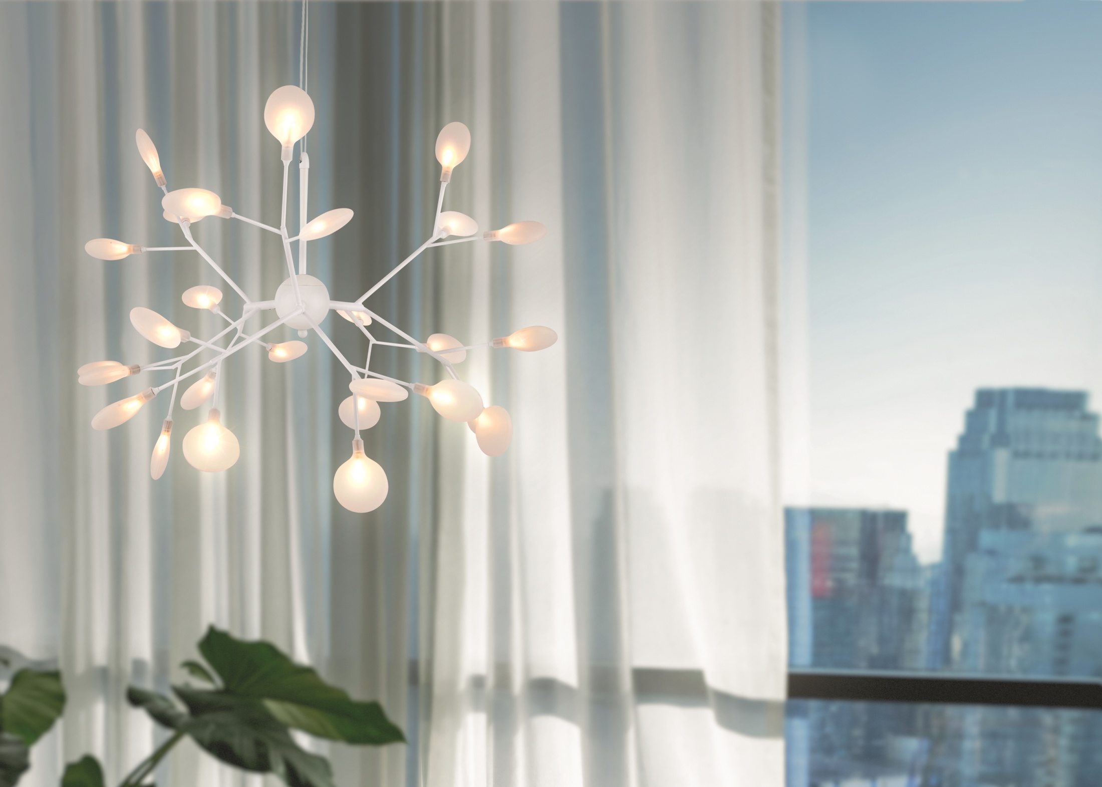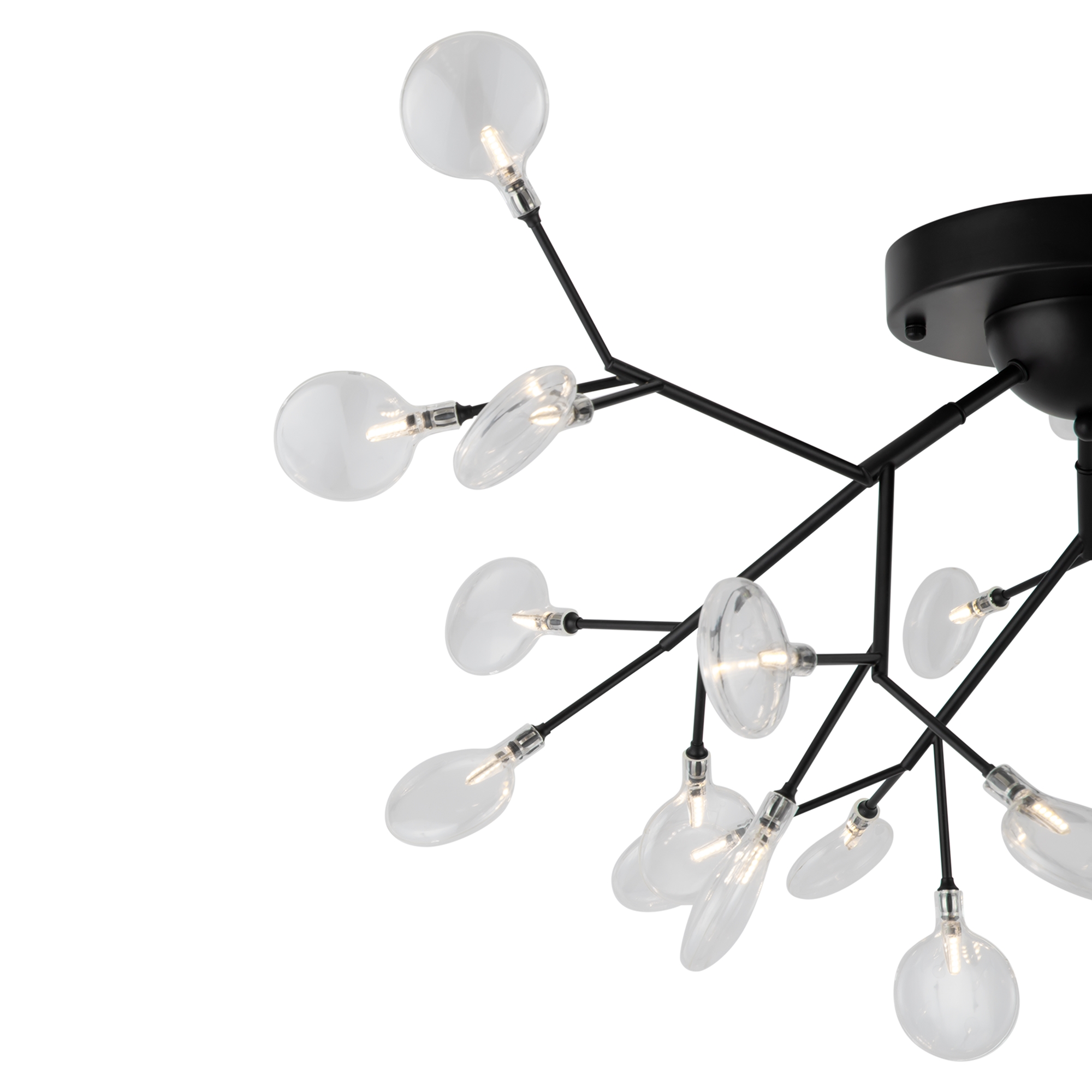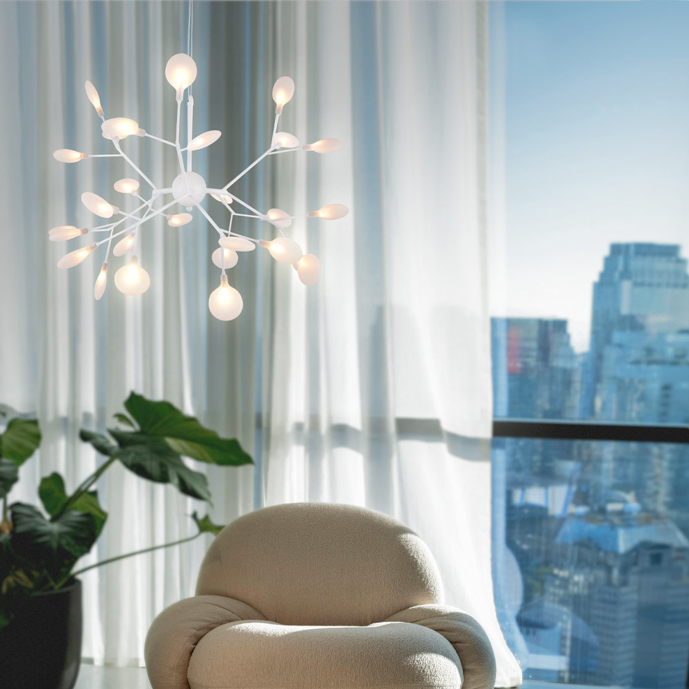Материал арматуры – металл. Оттенки – черный, белый. Стеклянные плафоны оригинальной формы. Трендовый флористический дизайн. Источник света – лампа G4.