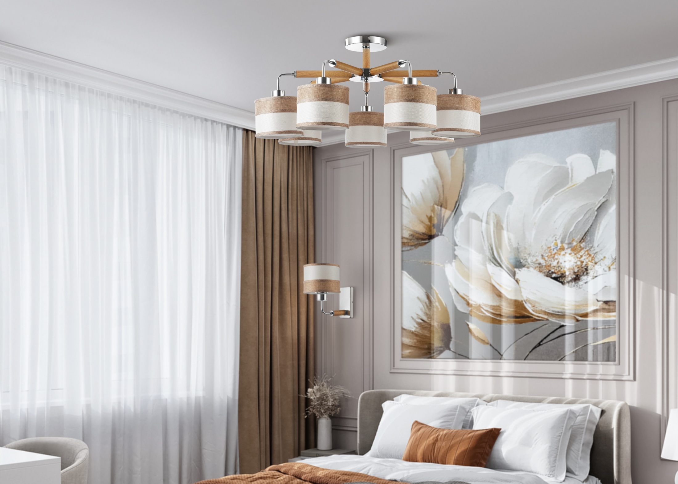 Двухцветные абажуры, сделанные из мешковины, сочетаются с древесной арматурой. Благодаря большому ассортименту изделий серии Helen легко выбрать светильник как для просторных помещений, так и для небольших.