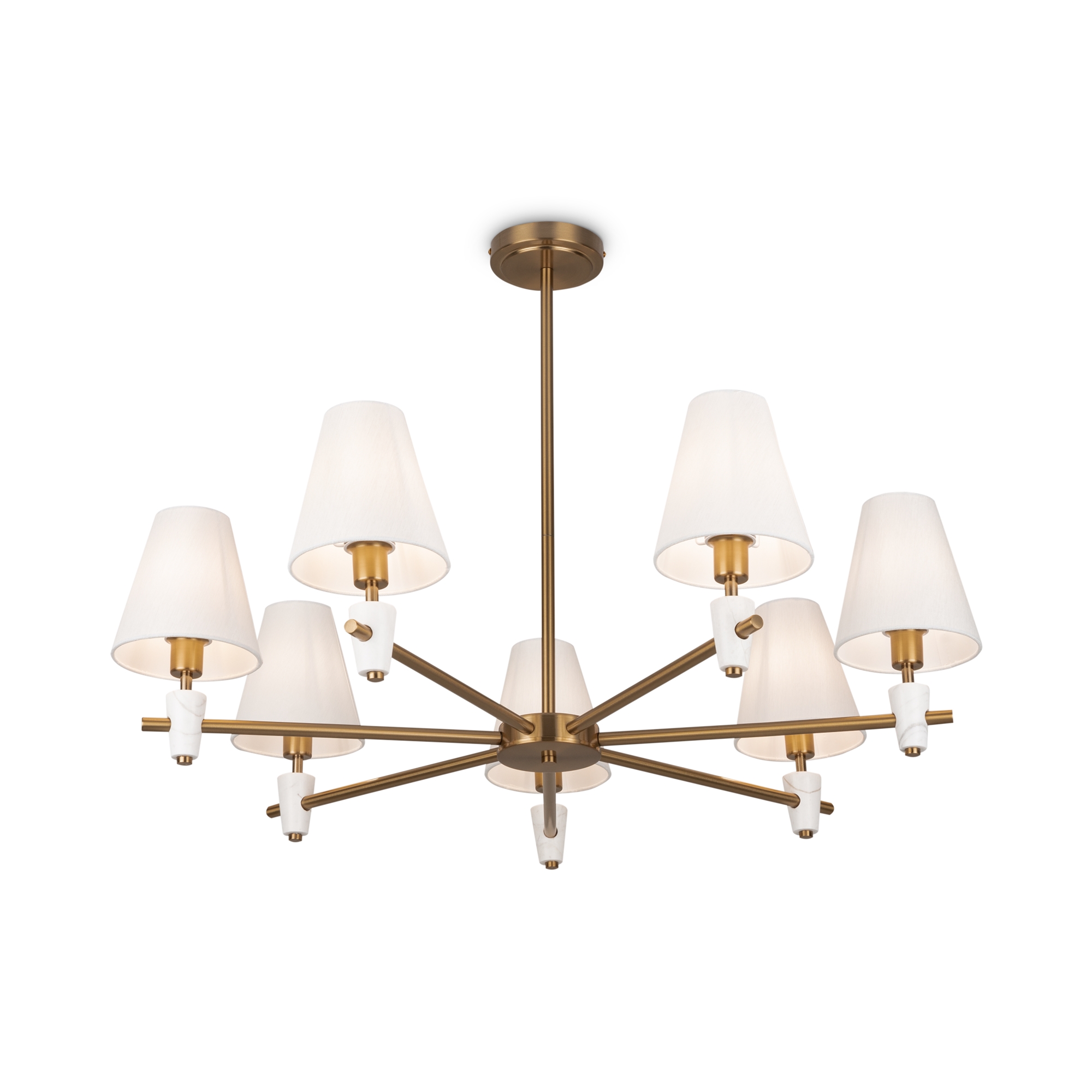Металлическая арматура в цвете латунь. Дополнительные элементы — минималистичные вставки из натурального белого мрамора. Белые абажуры из ткани в форме конуса. Источник света — лампа с цоколем Е14 или Е27.