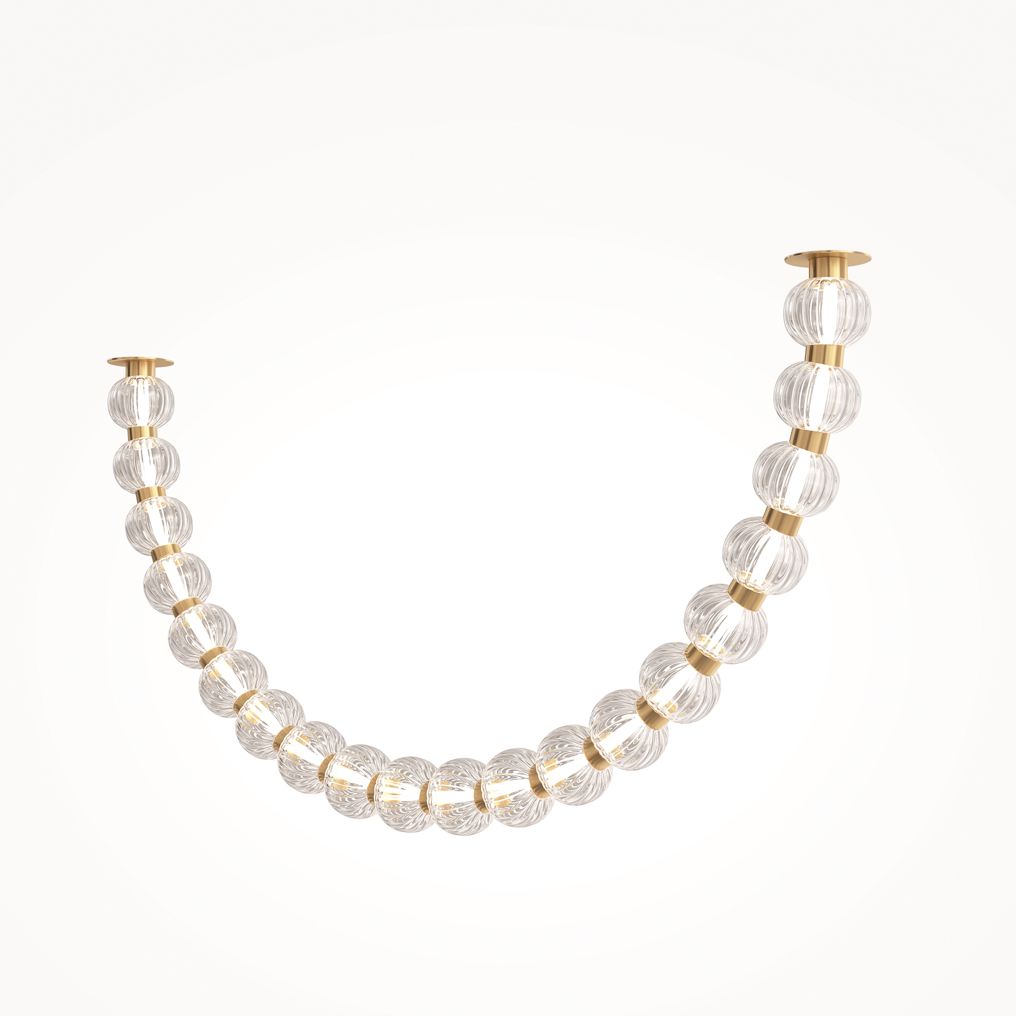 Арматура из металла, цвет – хром. Акцентный декор в виде рельефных сфер из литого стекла. Источник света – светодиодная лента – скрыта под акриловым рассеивателем. Регулируемая высота подвесных светильников.