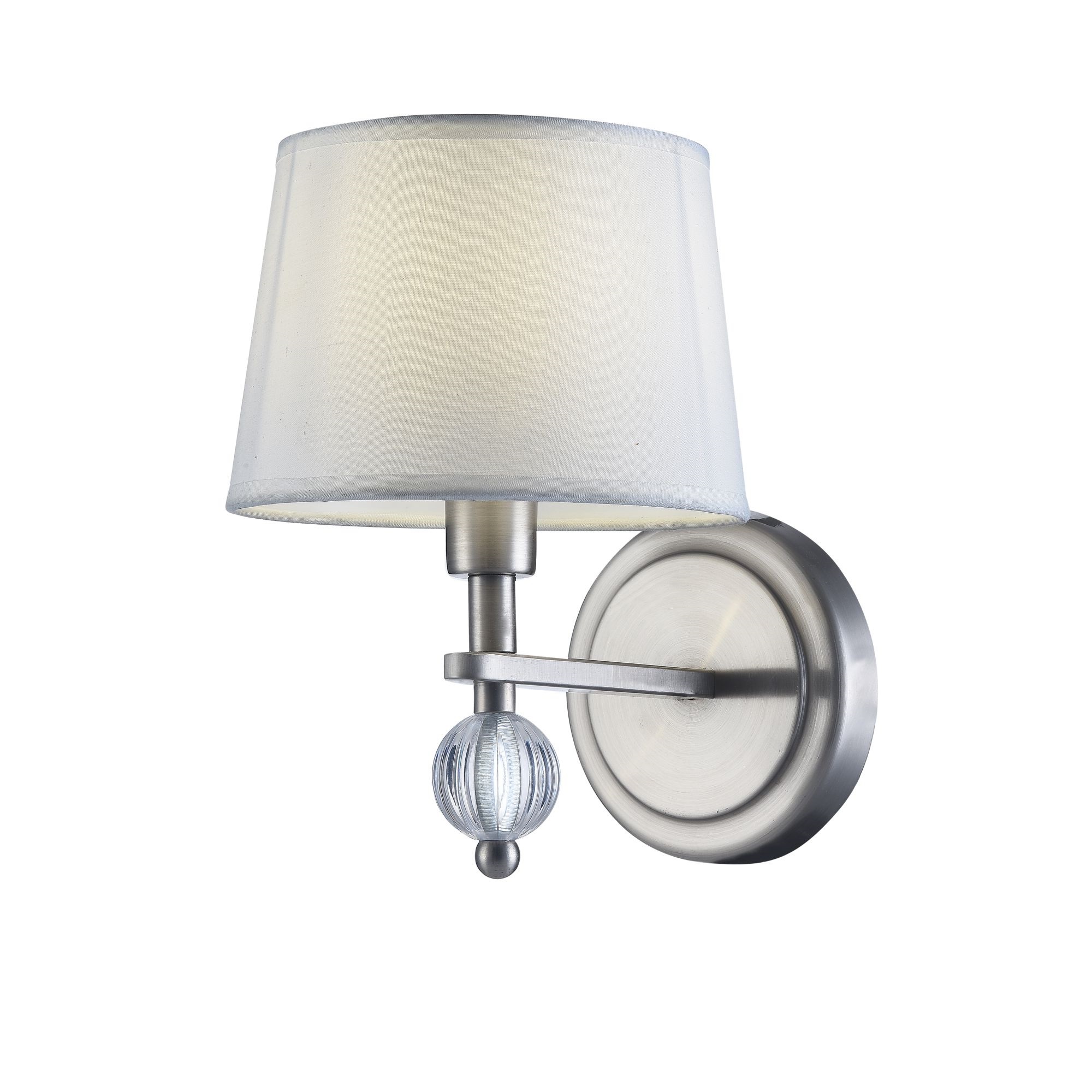 Серия светильников для интерьеров гостиных, спален и офисов в современном стиле. Арматура из метала цвета “никель” дополнена декоративными элементами из прозрачного акрила (шарики). Белые абажуры из текстиля на ПВХ.