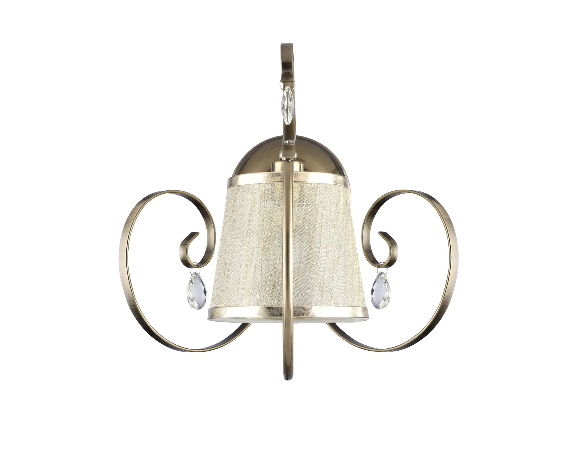 Абажуры и арматура светильников выполнены в разных цветах, с несколькими видами арматуры. Основание люстры украшено стеклянным декоративным элементом, а завитки рожков украшают подвески.