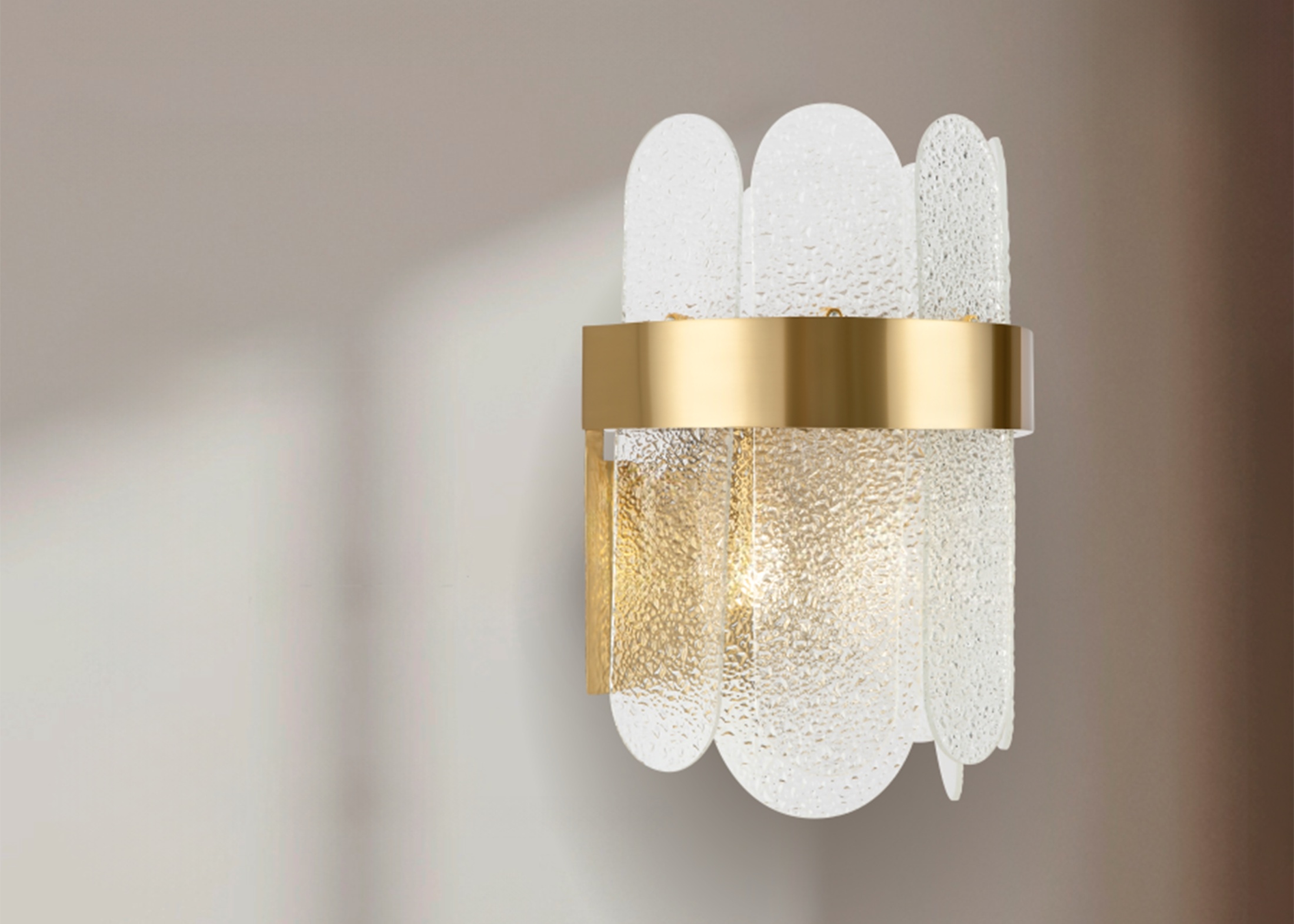 Арматура из металла. Цвет – латунь и никель. Стеклянный декор в двух вариантах: фактурный с эффектом «замороженного стекла» и глянцевый дымчатого оттенка. Источник света – лампа G9.