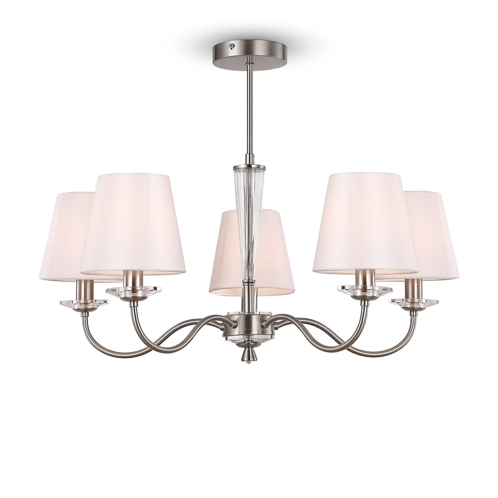 Металлическая арматура в двух оттенках на выбор: латунь и никель. Абажуры – текстиль белого цвета. Декоративные элементы из прозрачного стекла. Источник света – лампа с цоколем E14.