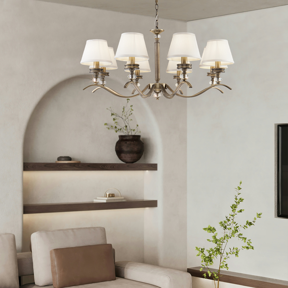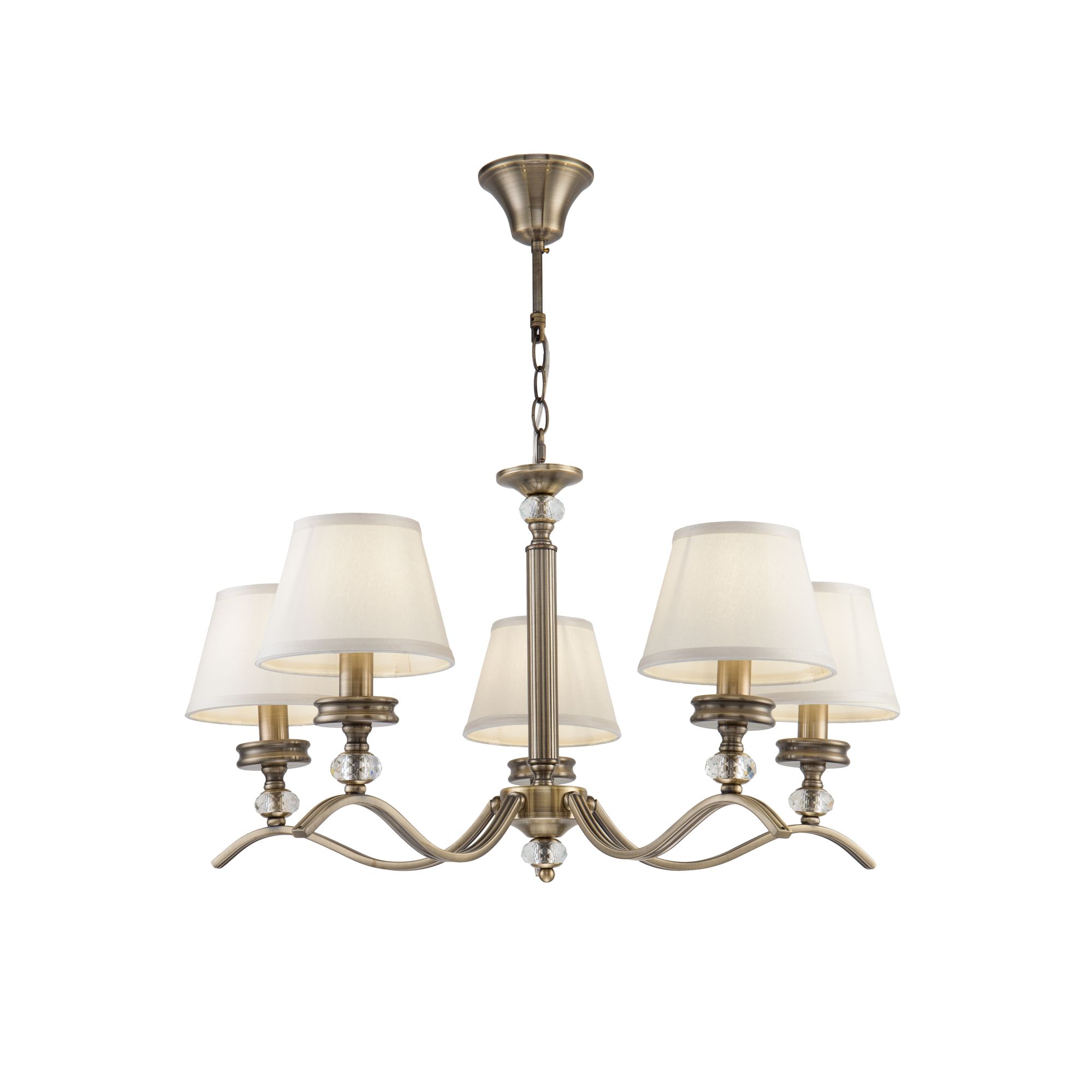 Элегантные светильники в классическом стиле. Металлическая арматура светильников Alessandra цвета латуни сочетается с кремовым цветом абажуров из ткани. Абажуры окантованы лентой в тон. Дизайн арматуры дополнен декоративным элементом из стекла.