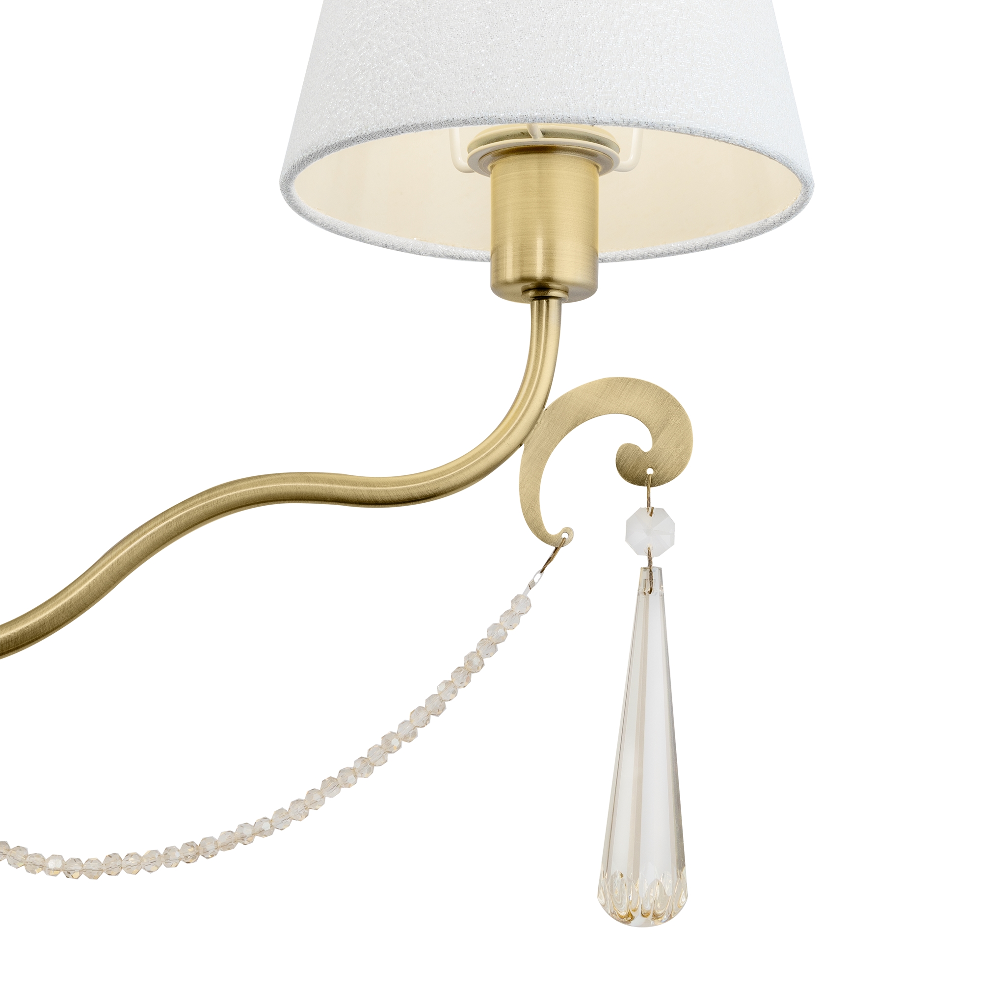 Металлическая арматура. Цвет – латунь. Абажуры из фактурной ткани белого цвета. Декор – хрустальные подвесы каплевидной формы. Одиночный подвес и торшер с цоколем Е27, лампа, бра и люстры – Е14.