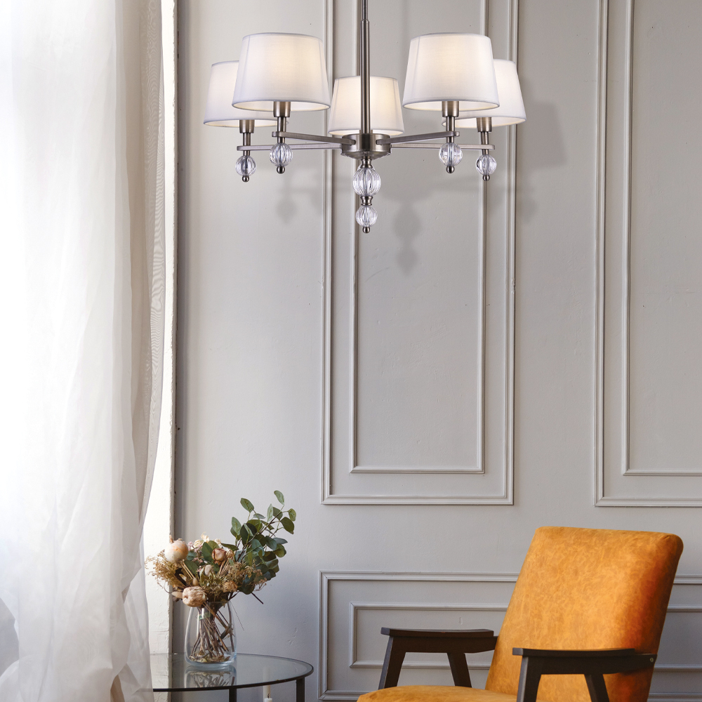 Серия светильников для интерьеров гостиных, спален и офисов в современном стиле. Арматура из акрила и метала цвета никель". Арматура дополнена декоративными элементом из акрила (шарики). Белые абажуры сделаны из текстиля на ПВХ."