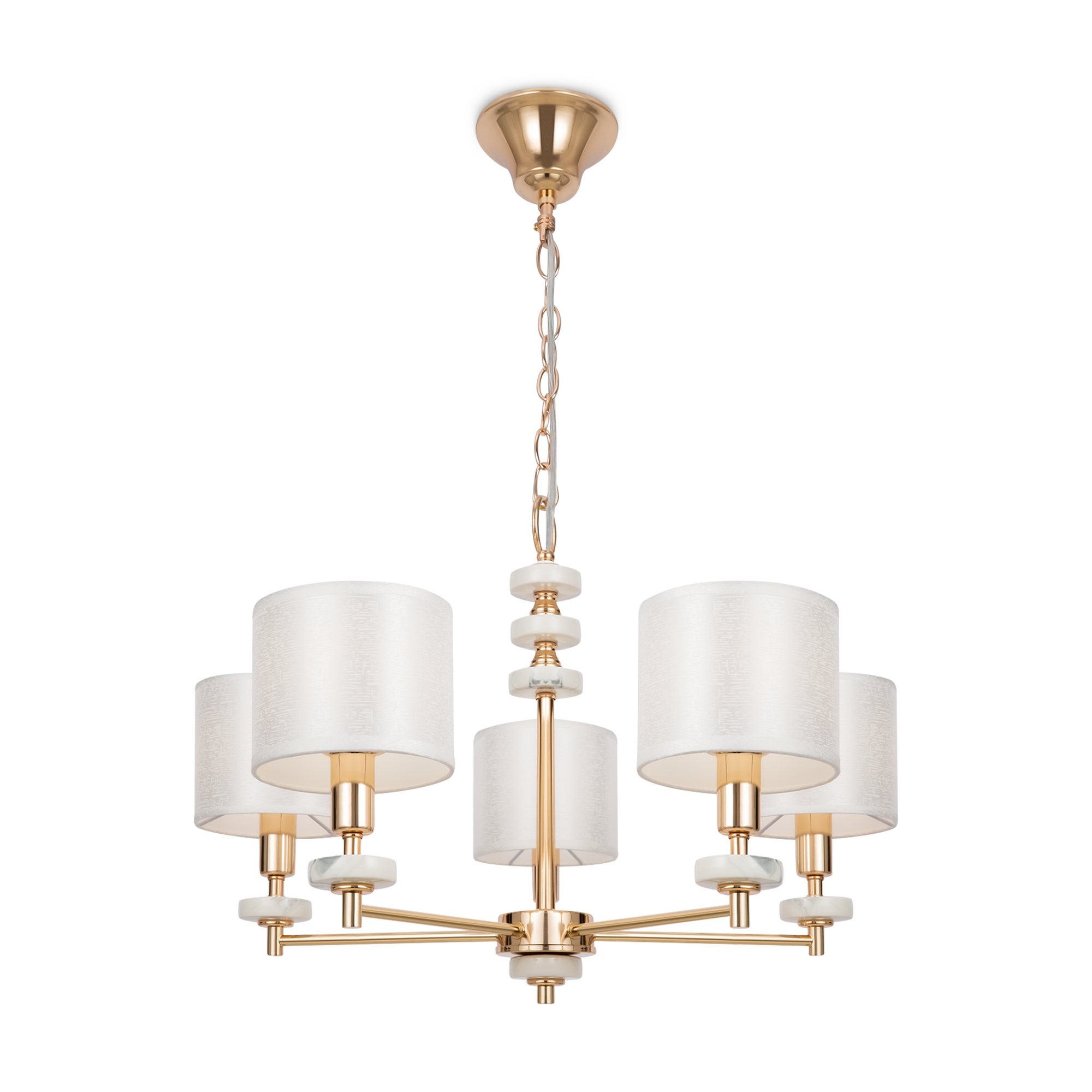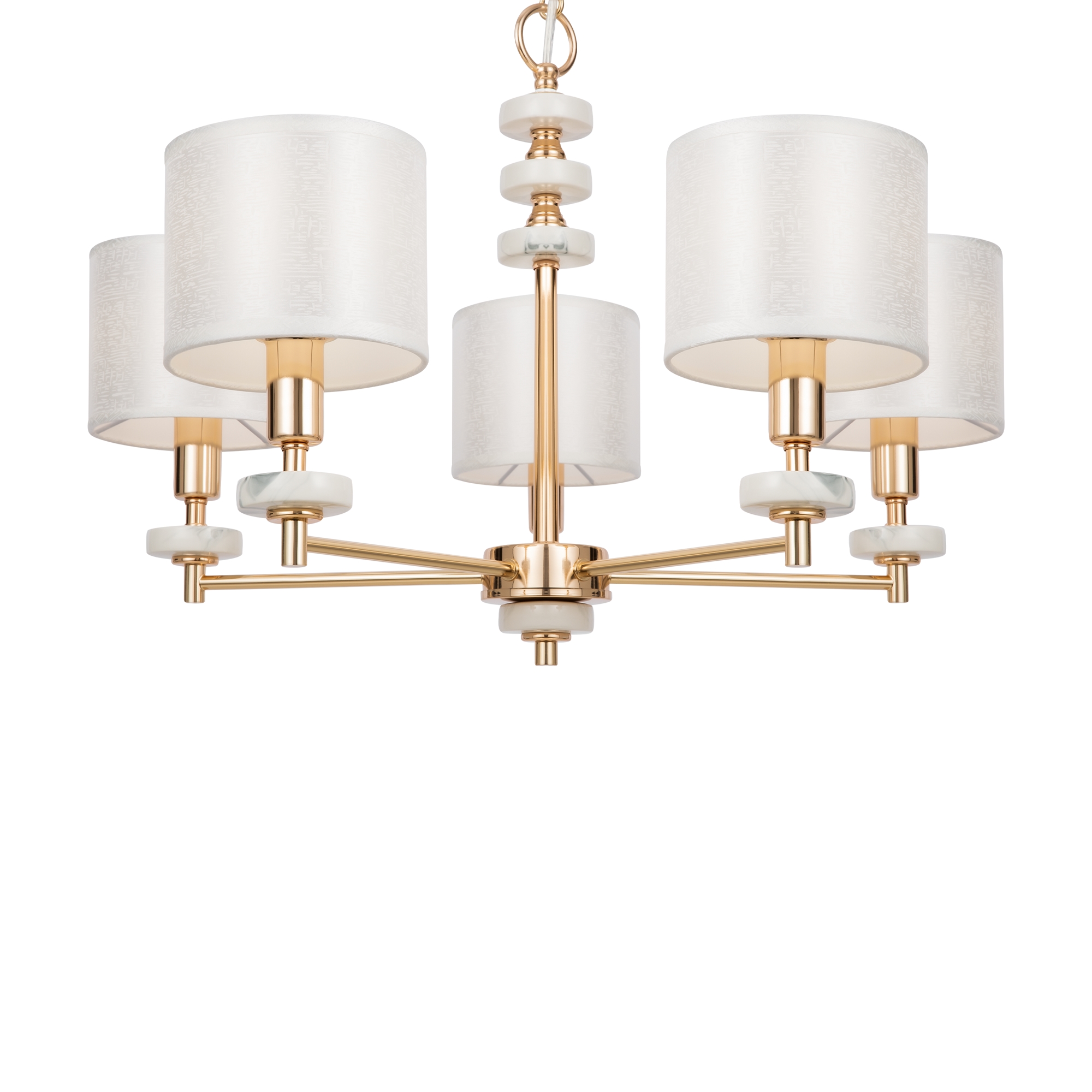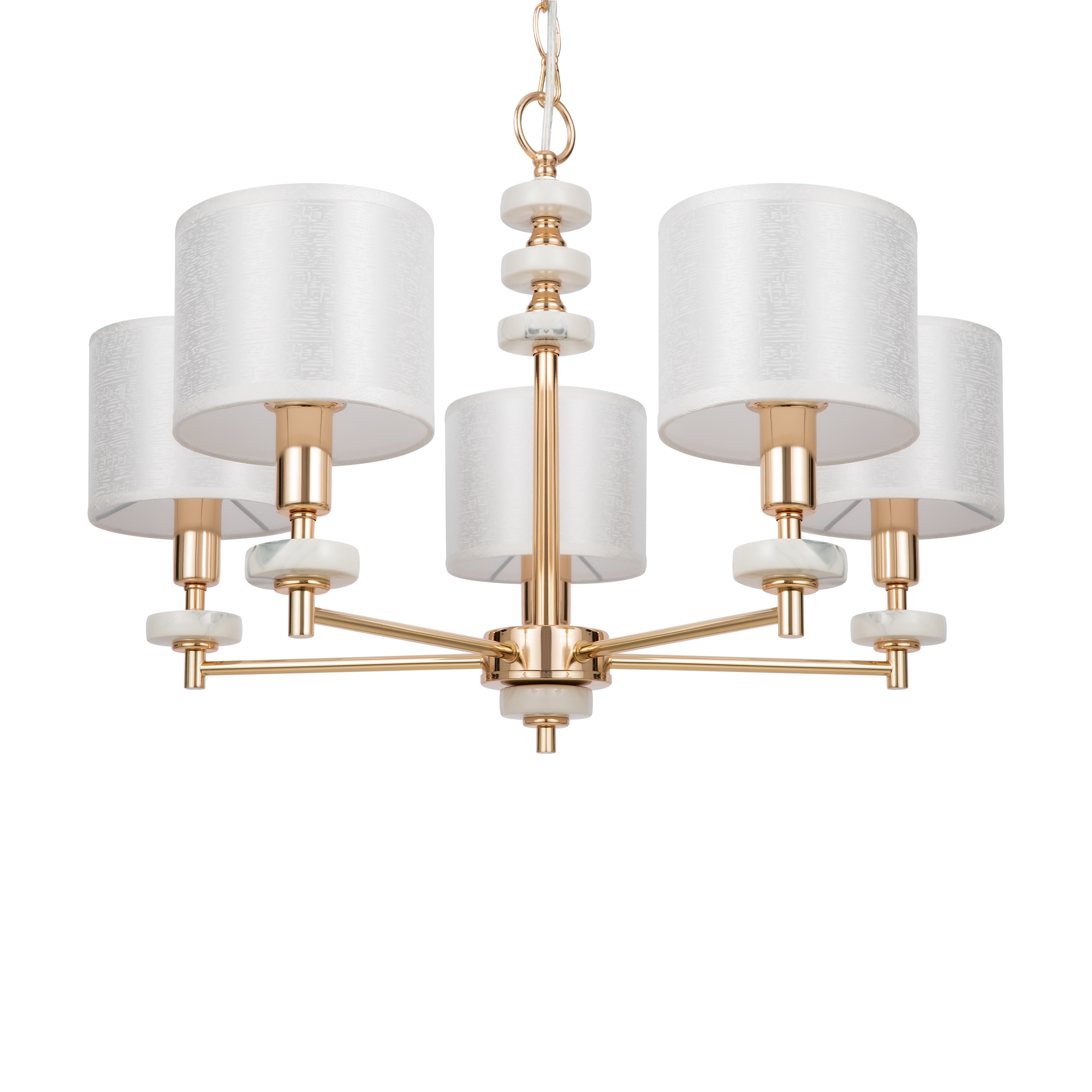 Металлическая арматура золотого оттенка. Абажуры – текстиль на ПВХ кремового цвета. Трендовый керамический декор с имитацией мрамора. Источник света – лампа с цоколем E14.