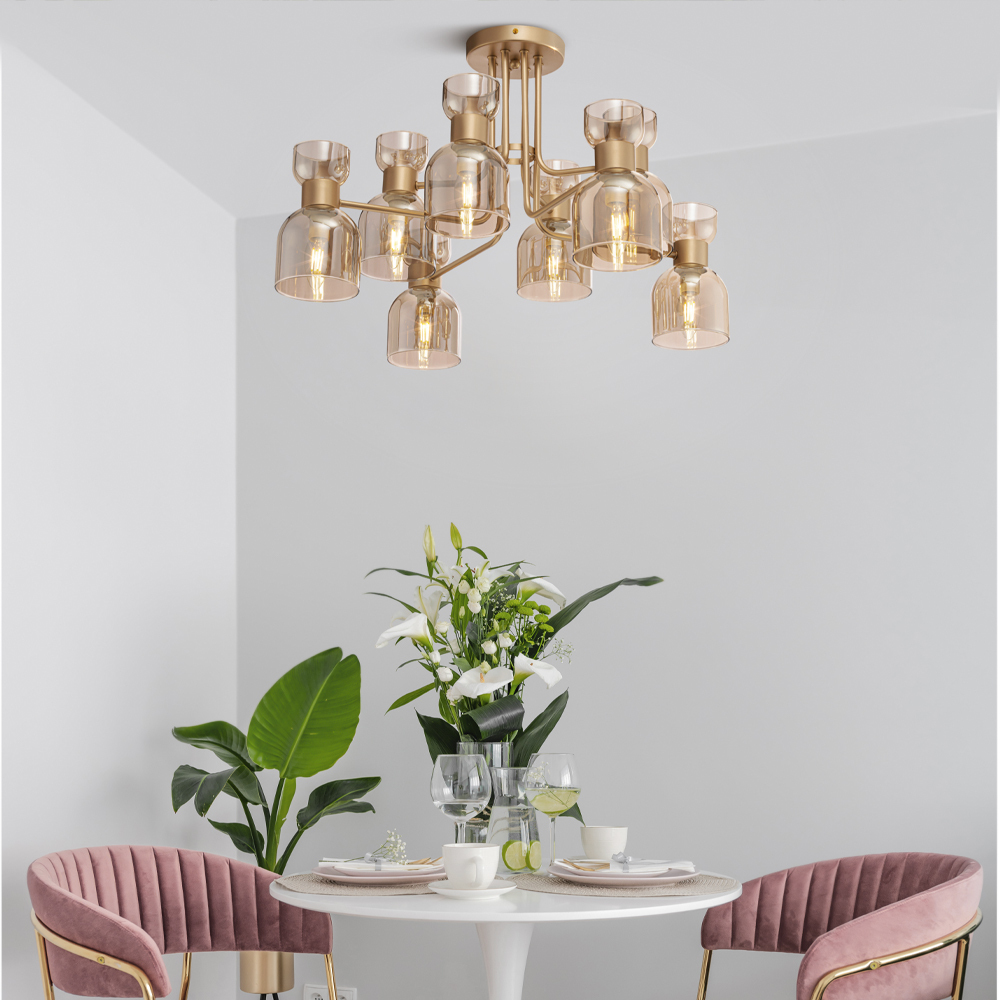 Материал арматуры – металл. Цвет – матовое золото. Плафоны оригинальной формы из янтарного стекла. Компактные размеры. Источник света – лампа с цоколем E14.
