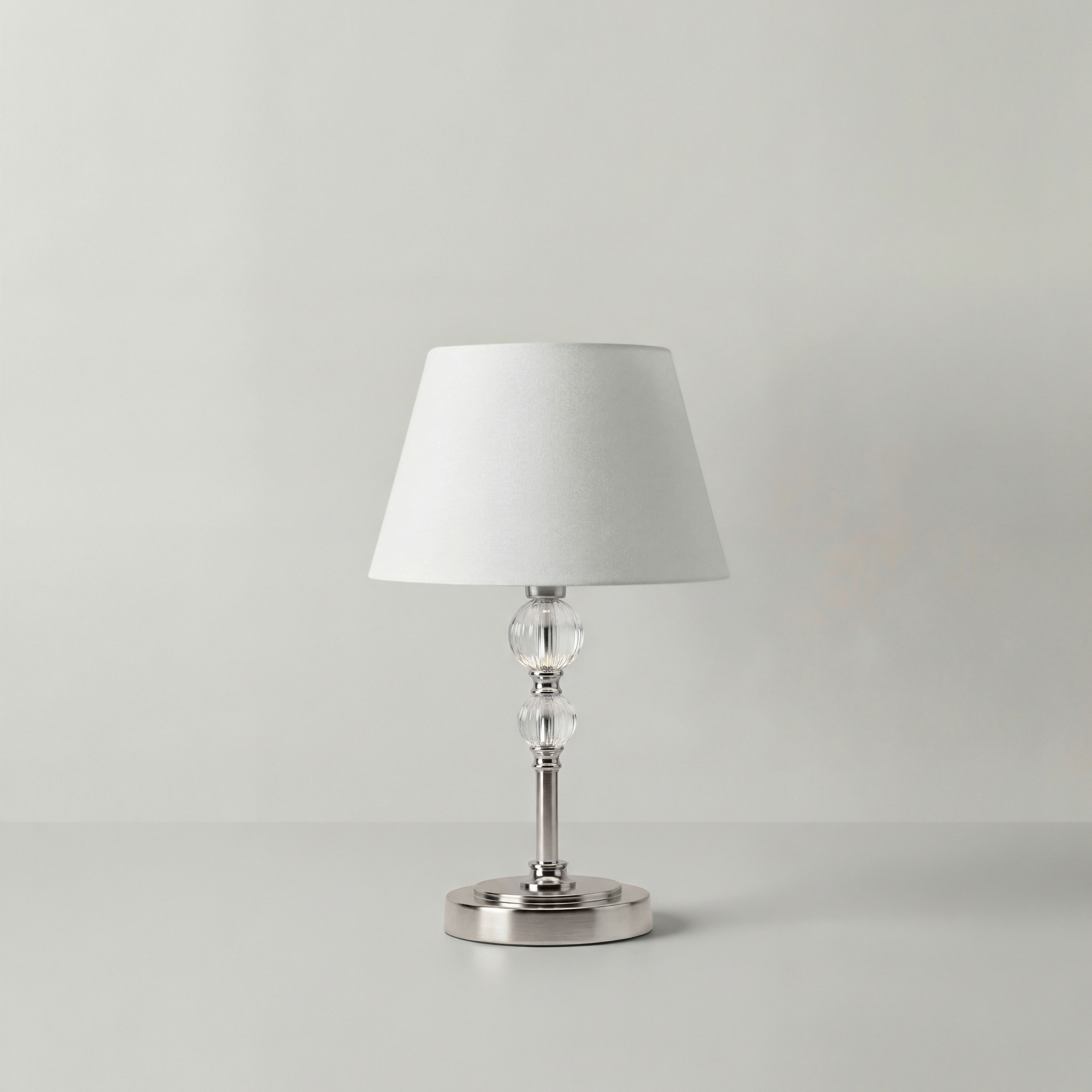 Серия светильников для интерьеров гостиных, спален и офисов в современном стиле. Арматура из метала цвета “никель” дополнена декоративными элементами из прозрачного акрила (шарики). Белые абажуры из текстиля на ПВХ.