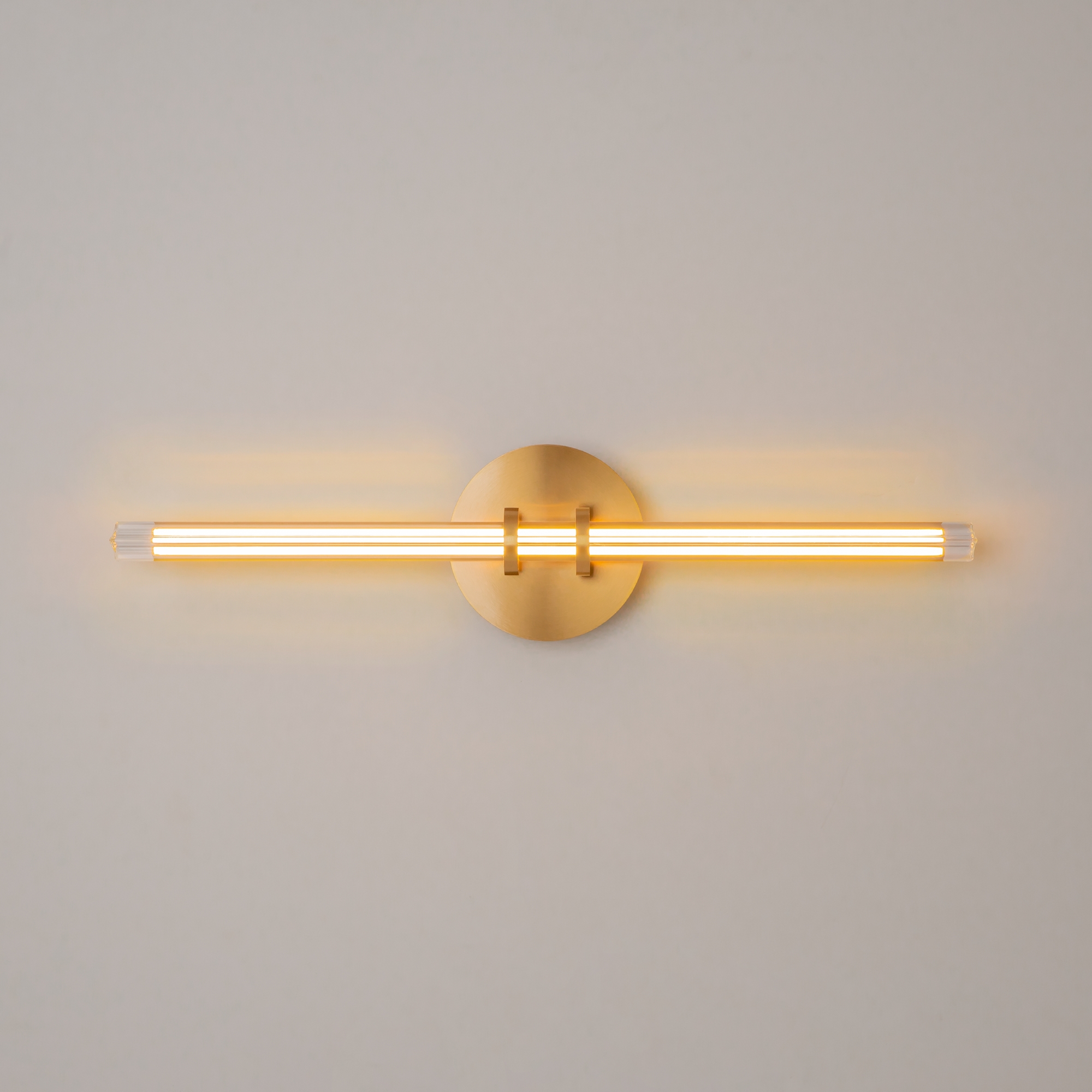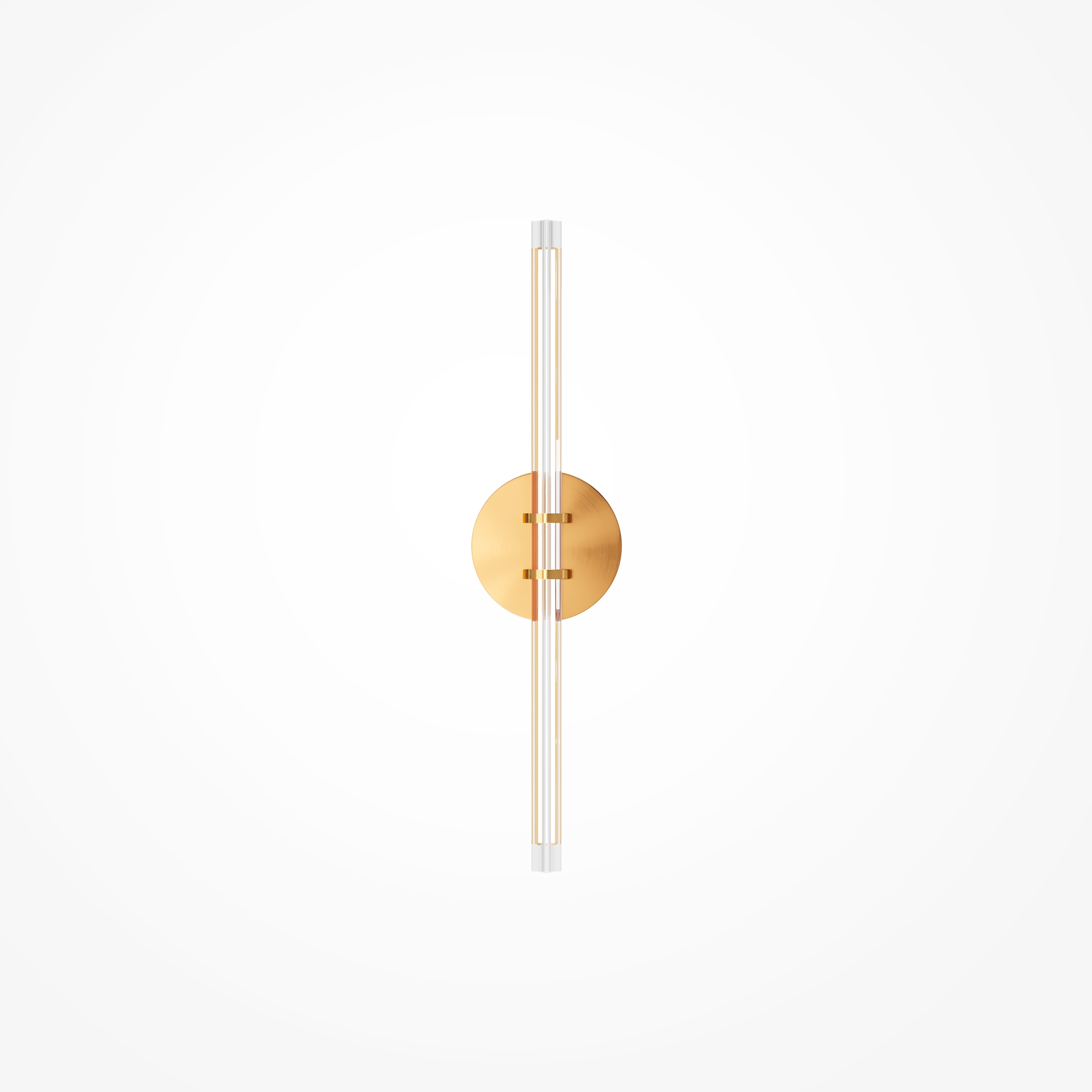 Металлическая арматура латунного цвета дополнена сатинированным финишным покрытием. Тонкие плафоны, изготовленные из рифленого стекла. Два варианта длины: 1200 и 1500 мм. Трехметровый провод можно регулировать для установки в помещениях с высокими потолками. Цветовая температура LED-источника света — 3000К, угол рассеивания — 120 градусов.