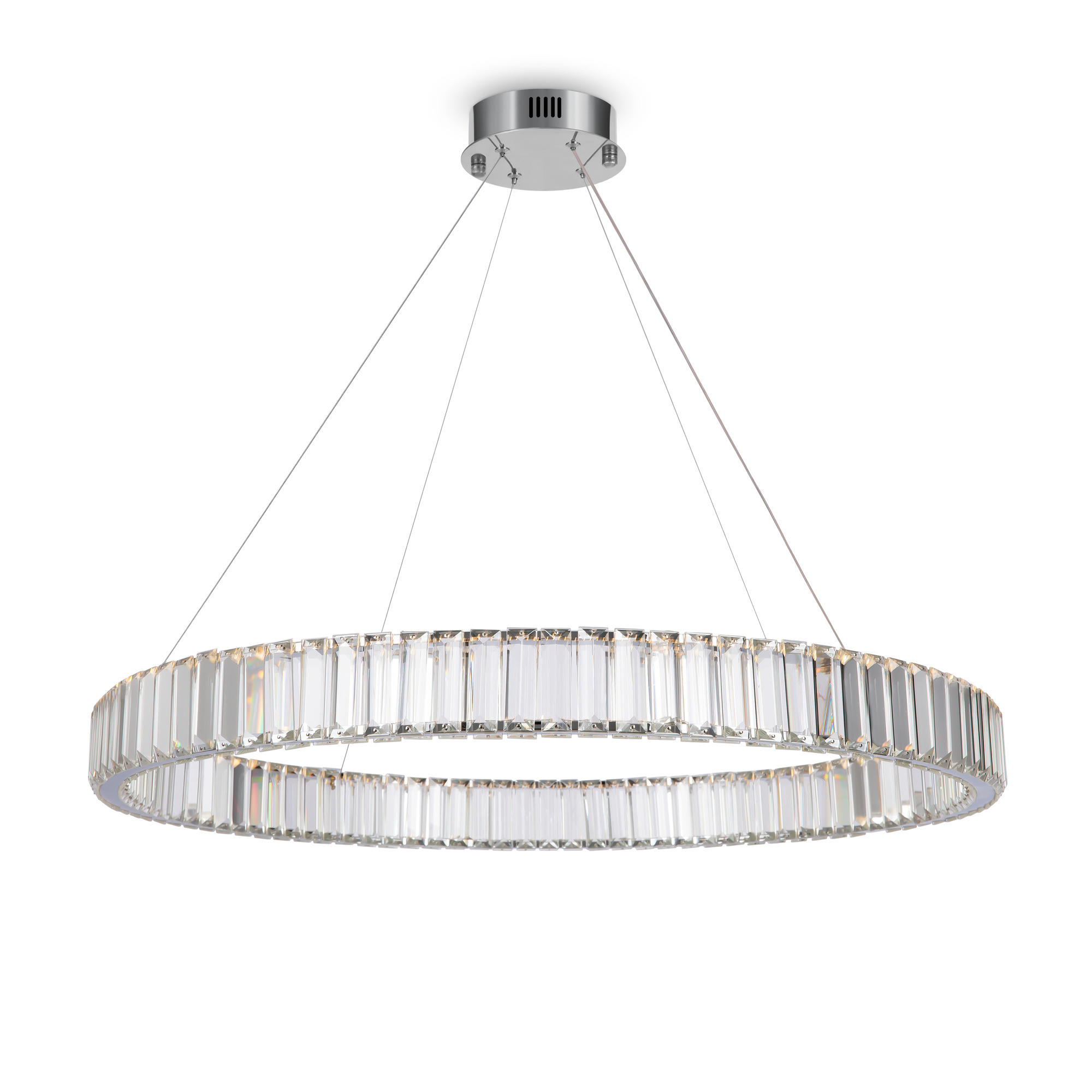 Металлическая арматура в цвете латунь и хром. Хрустальные декоративные кольца с геометричными гранями. LED-источник света. Регулировка цветовой температуры (3000-4000-5000K) и яркости 4G-dimming при помощи пульта (в комплекте).