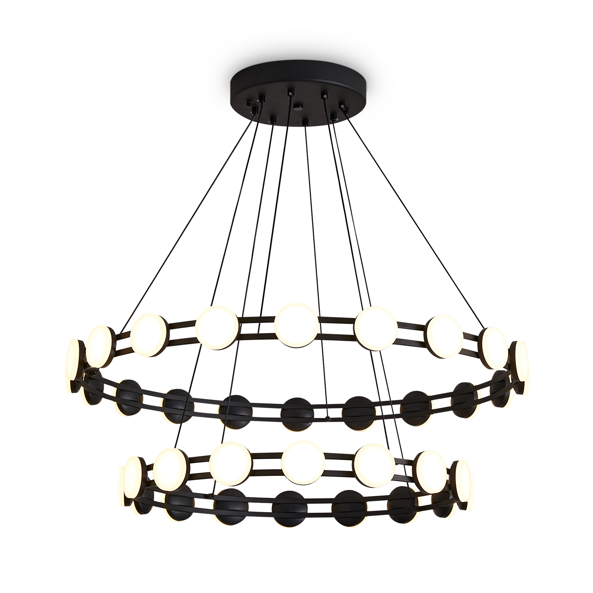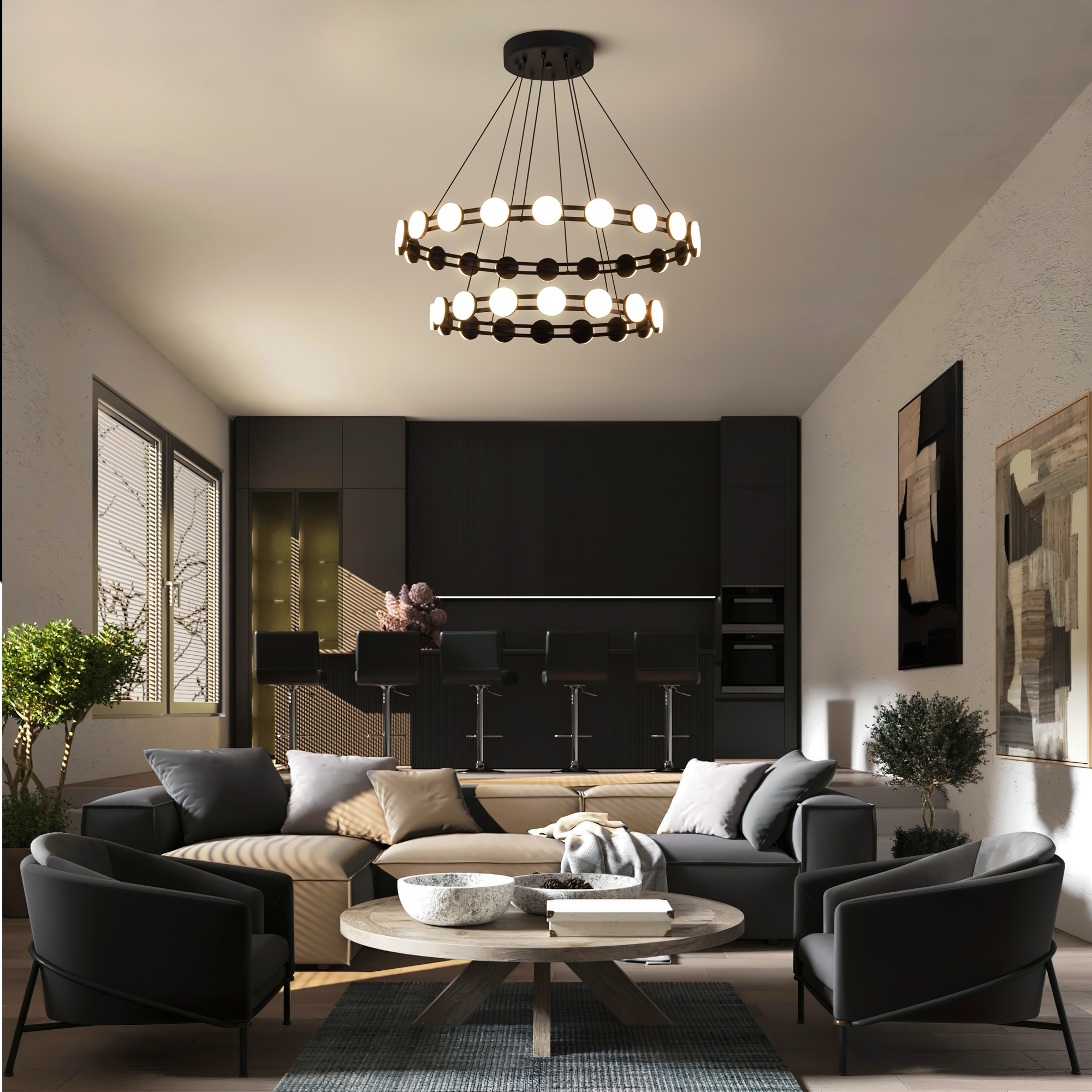 Подвесные светильники серии Collar с одноярусным и двухъярусным расположением колец с LED источниками света. Доступны два размера: диаметр 600 мм и 800 мм. Арматура — металл черного цвета. Цветовая температура 3000K, угол рассеивания 120°. Высота регулируется. Плафоны из акрила равномерно освещает пространство. Светильники диммируемые. Минималистичный дизайн подходит для различных типов интерьеров, обеспечивая эффективное освещение пространства.