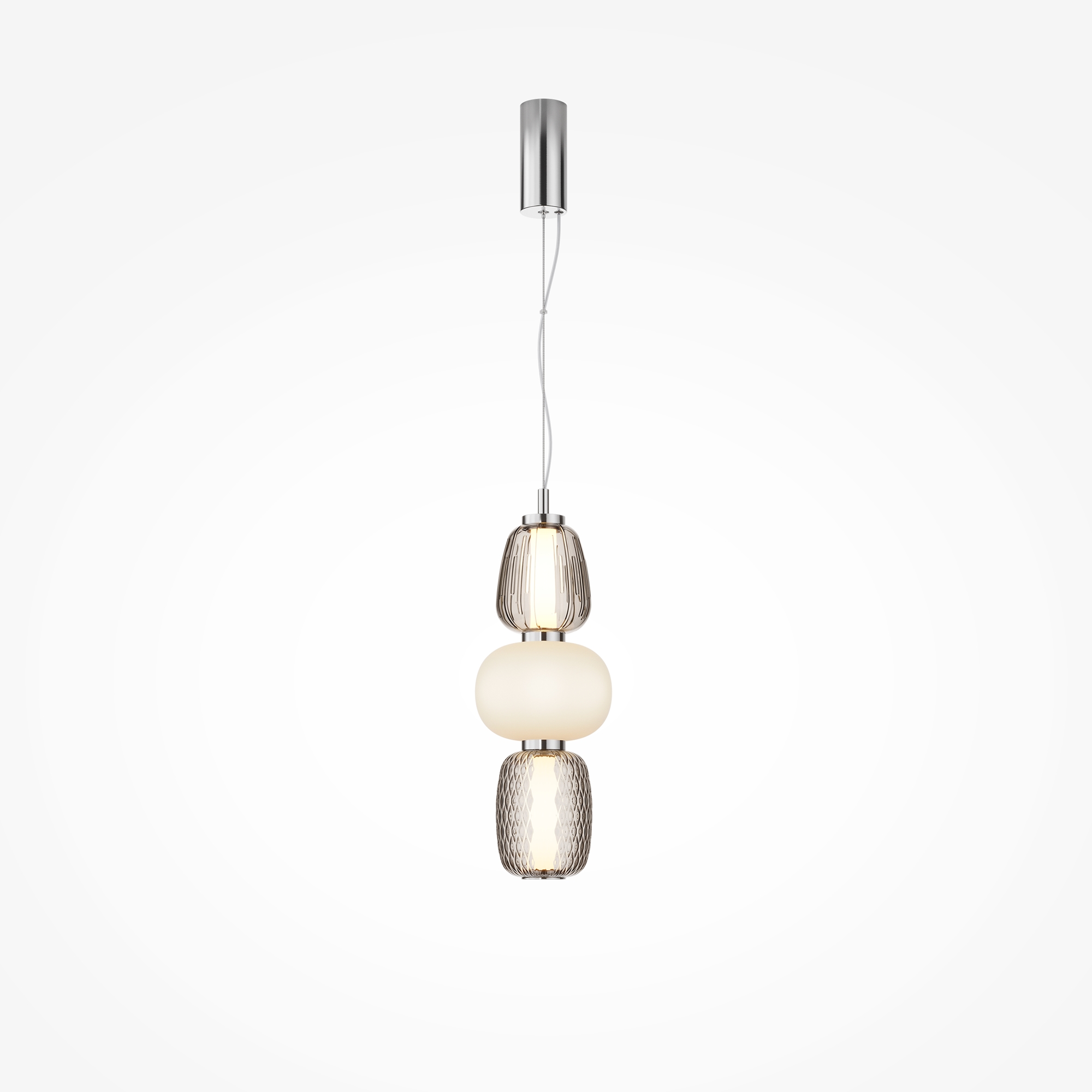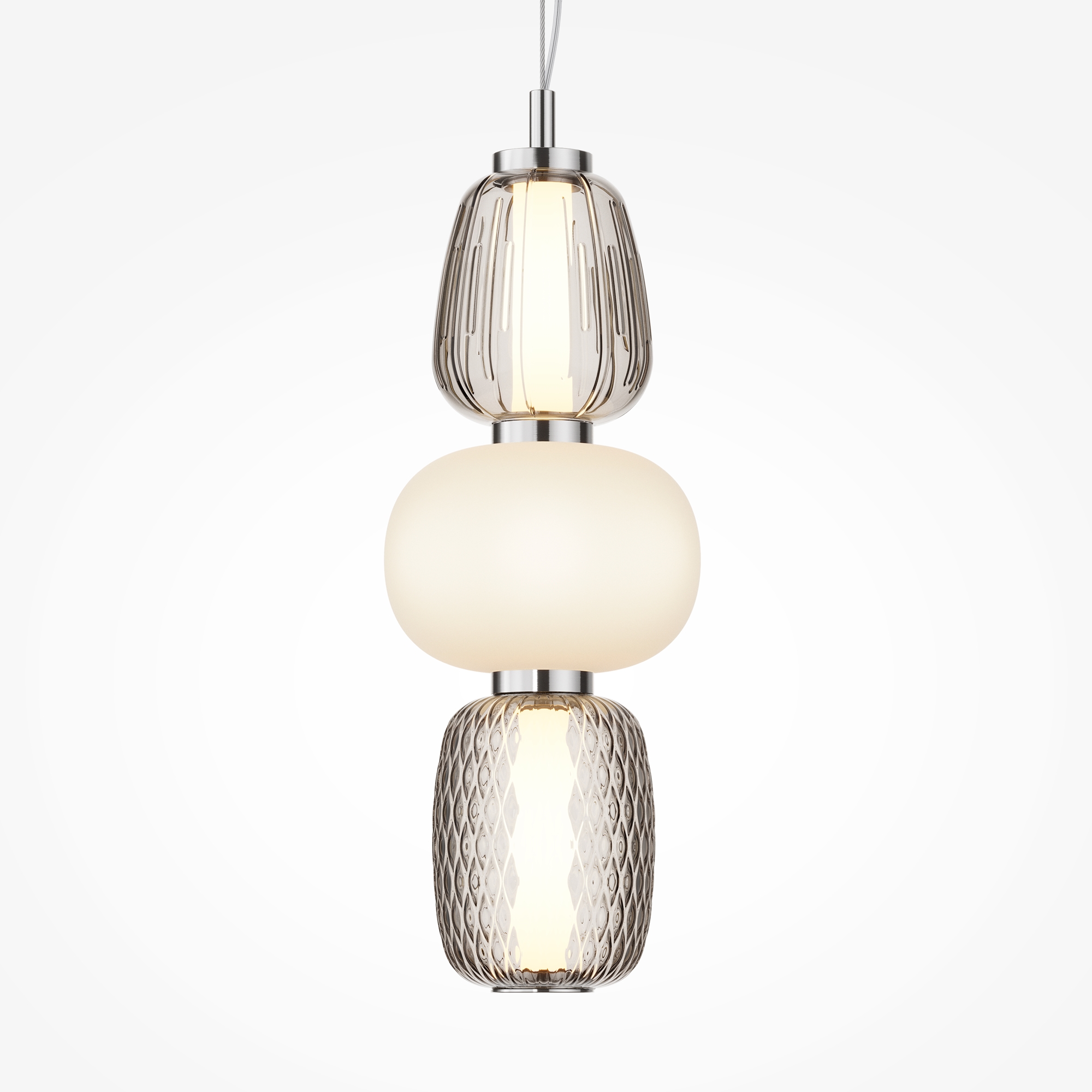 Металлическая арматура, цвет - золото, хром. Микс плафонов округлых и вытянутых форм из белого матового и прозрачного стекла с сетчатым и с линейным повторяющимся рельефным рисунком. Регулируемая высота подвесных моделей, провод - 3 метра. LED-источник света, цветовая температура 3000К.