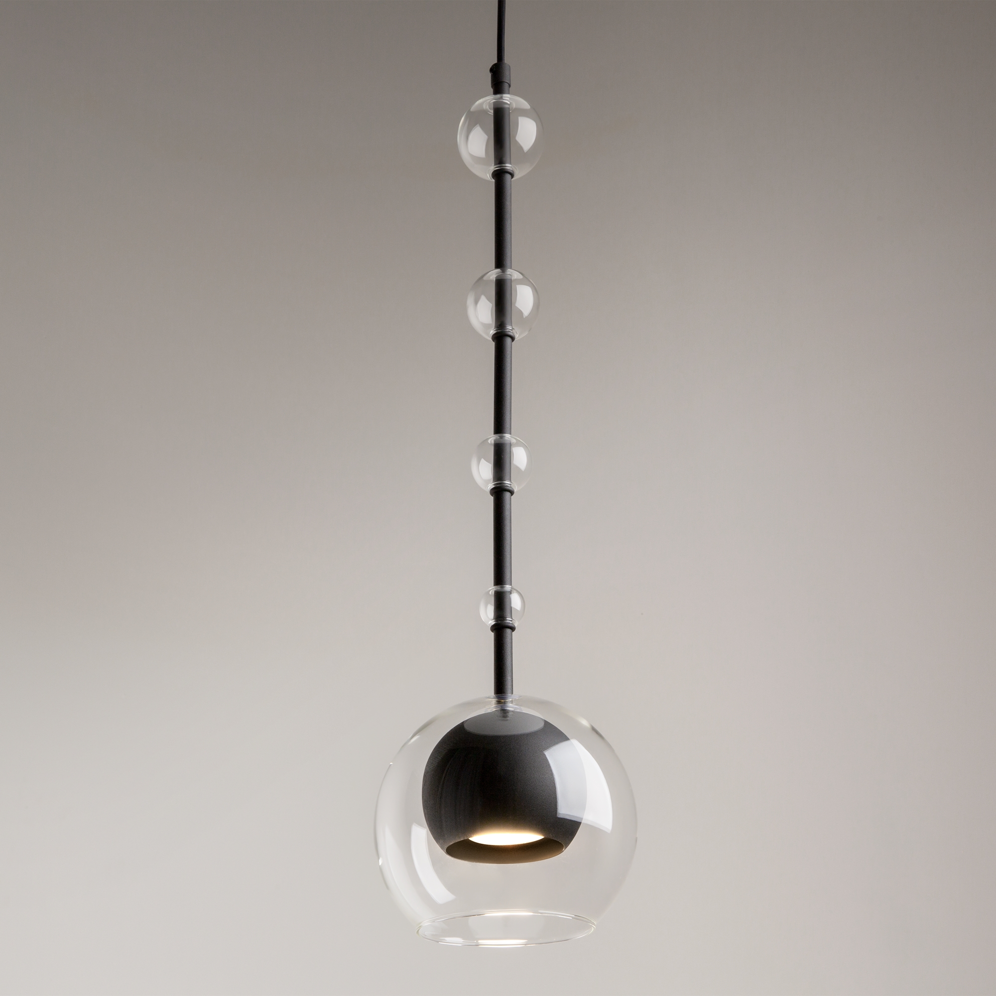 Арматура - металл, плафоны - стекло. Цветовый комбинации арматуры и плафона: черный + прозрачный, черный + янтарный, латунь + прозрачный. Элементы декора - выдувные бусины" из стекла. Высота проводов регулируется. Источник света - лампа с цоколем GU10."