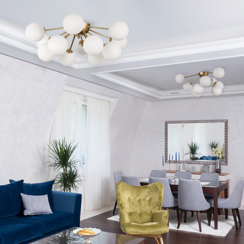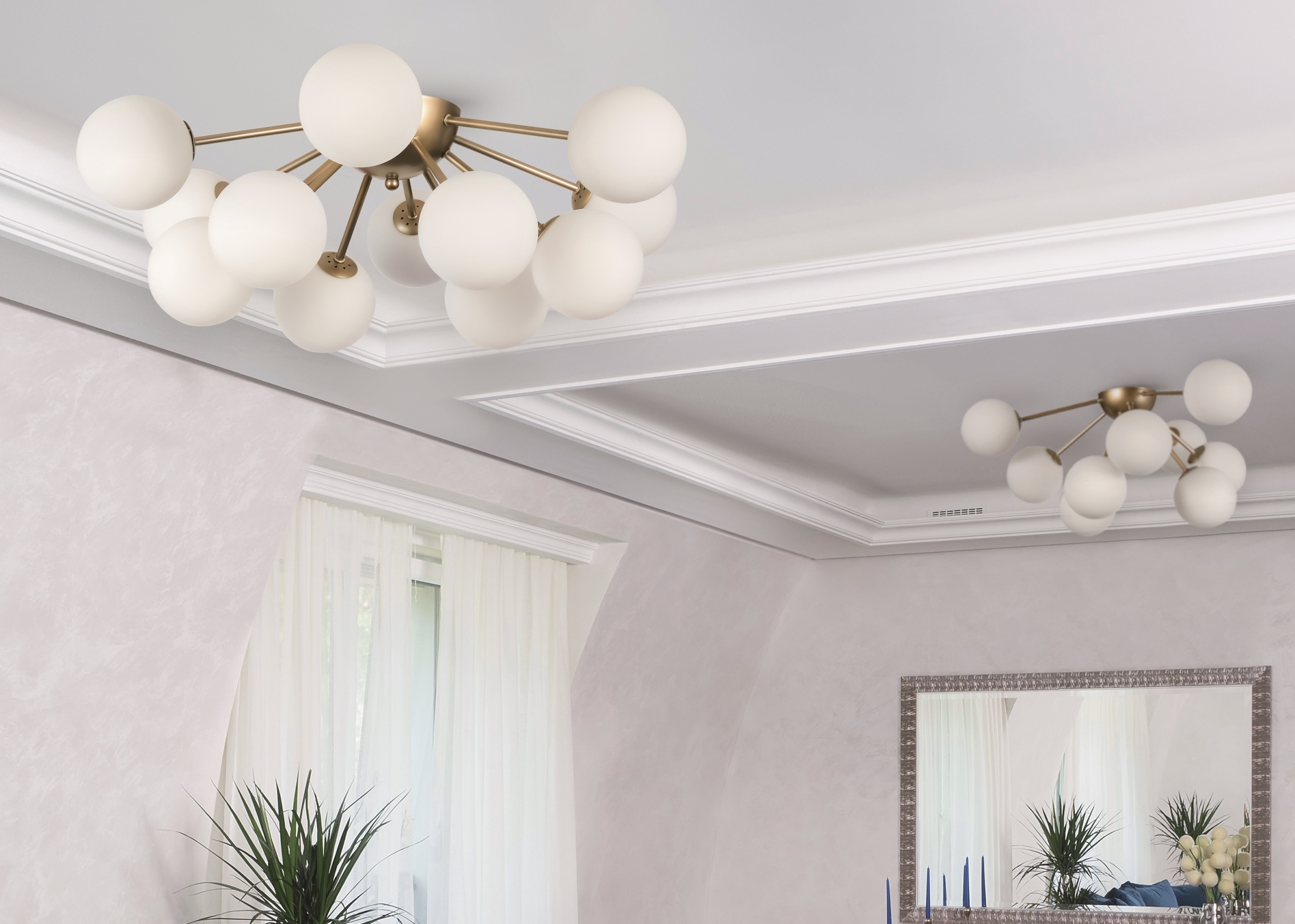 Оригинальная композиция, объединяющая стеклянные плафоны-сферы и металлическую арматуру цвета латуни, актуальна для освещения современных интерьеров Благодаря большому ассортименту серии и наличию в ней люстр различного диаметра и высоты, каждый сможет выбрать светильник необходимых размеров. Разнообразие конструктивных решений также не оставляет равнодушным: ассиметричные светильники и модели с дугообразными рожками-лучами займут достойное место в любой обстановке. Люстры на 12, 9 и 6 плафонов позволяют подобрать оптимальную яркость и мощность подсветки, исходя из размеров помещения.