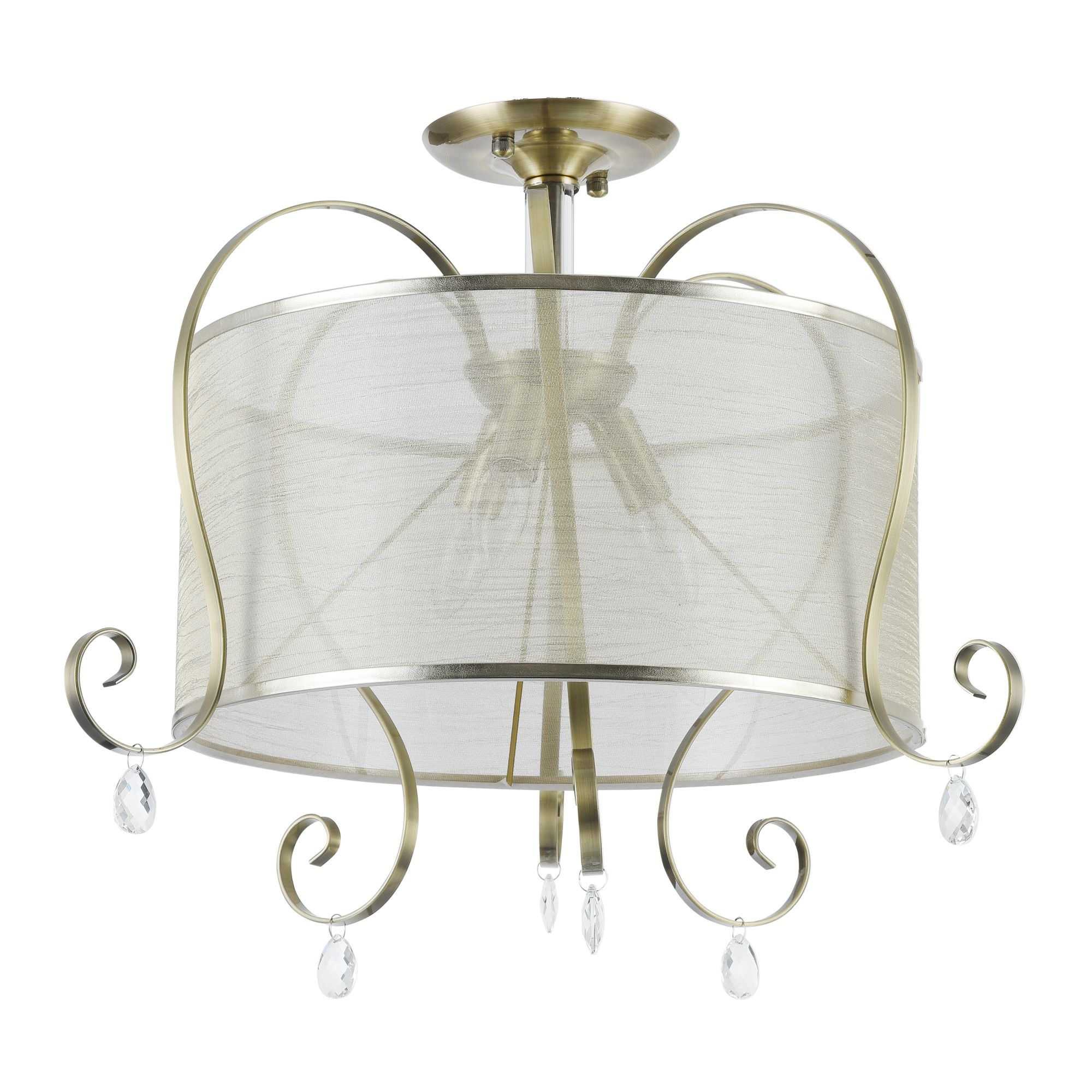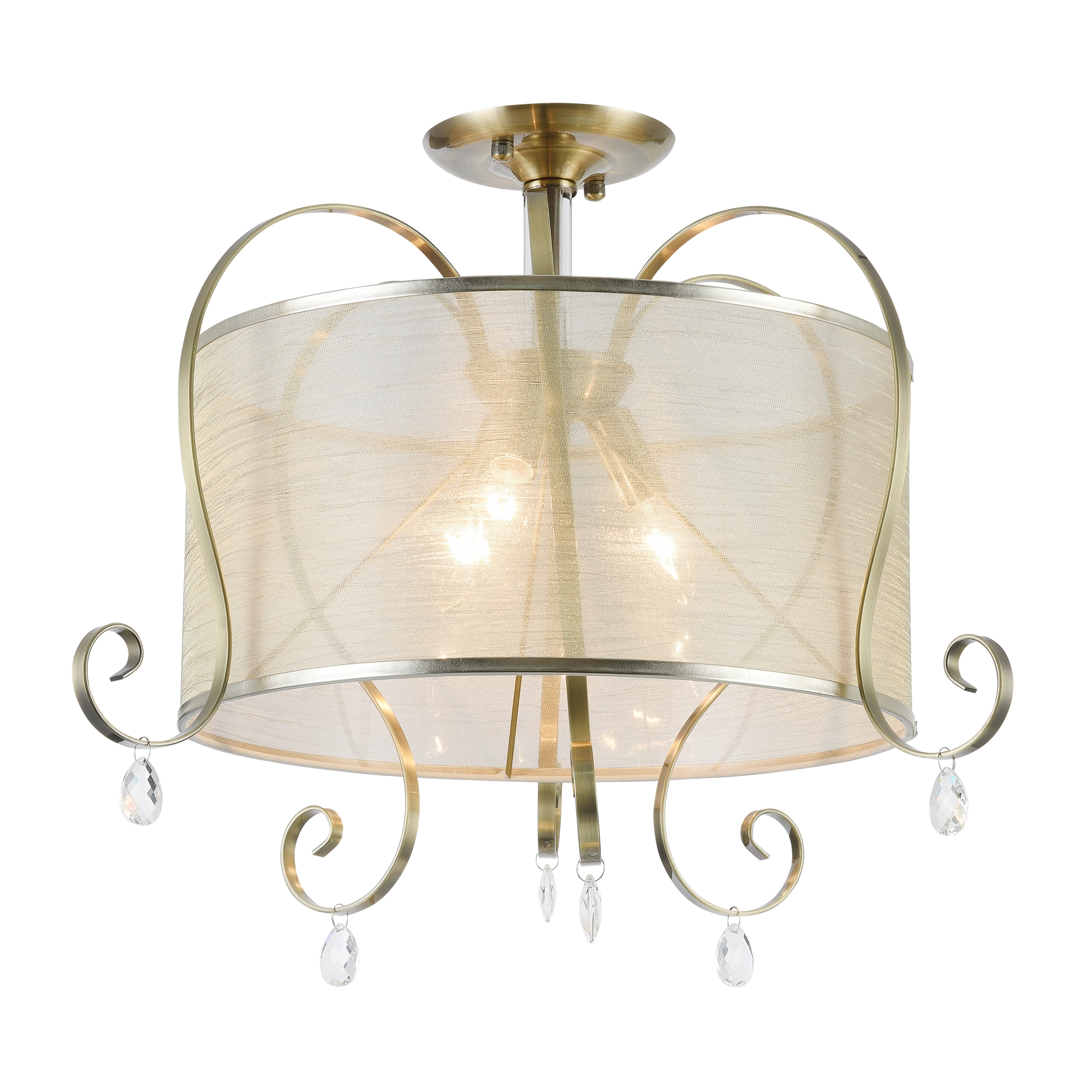 Абажуры и арматура светильников выполнены в разных цветах, с несколькими видами арматуры. Основание люстры украшено стеклянным декоративным элементом, а завитки рожков украшают подвески.