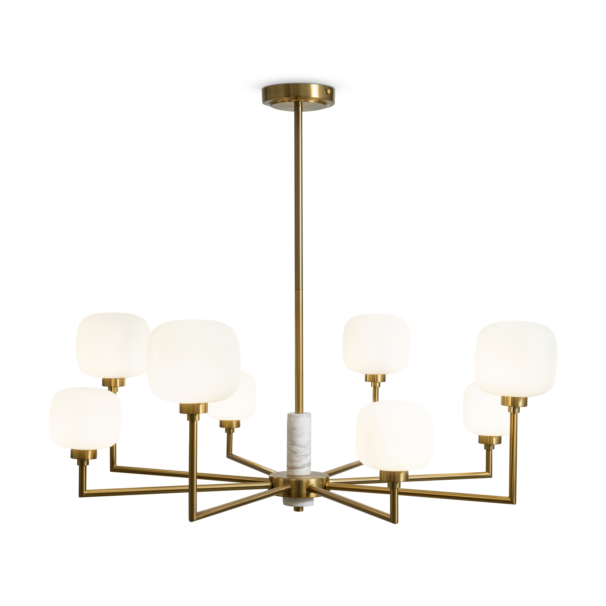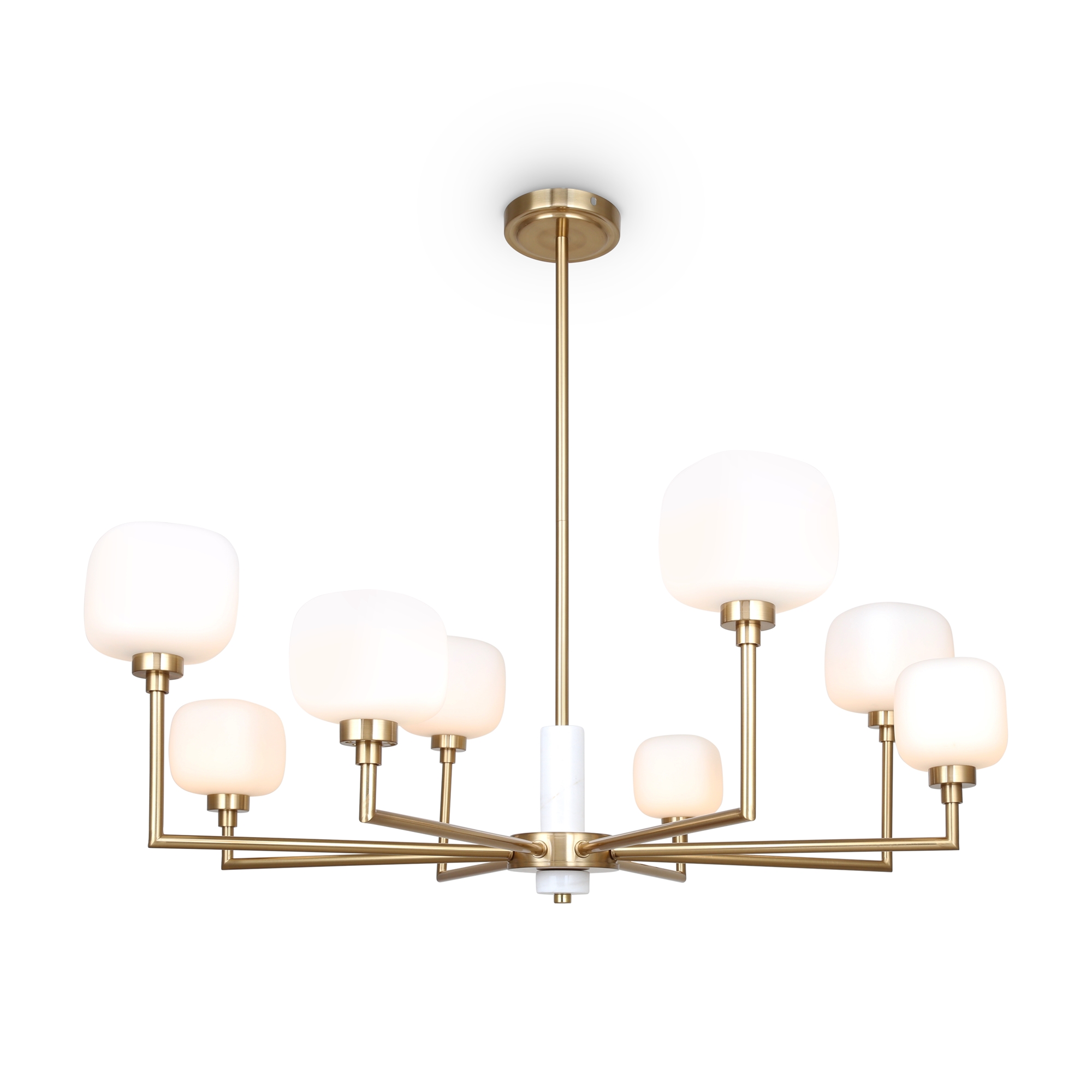 Металлическая графичная арматура цвета латунь. Плафоны из белого матового стекла в необычной форме округлых кубов - закреплены на разной по высоте комбинации. Мягкое равномерное освещение. Источником света служит лампа с цоколем G9.